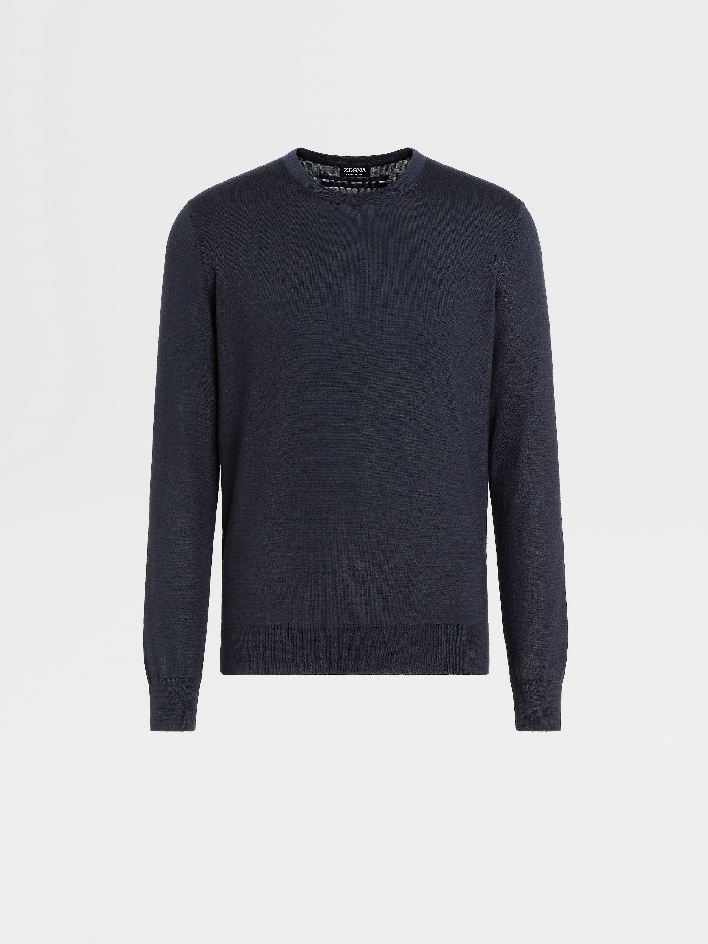 The navy blue mélange Cashseta crewneck brings together cashmere and silk. INFO Zegna's refined blend of cashmere and silk lends the navy blue mélange Cashseta crewneck its distinctive finish. The natural knit feels soft against the skin, elevating a simple design into a luxurious essential. The classic ribbed collar and trims complete the look. Customize this item with our Made to Measure Service. For more information, please contact our Customer Care or visit your nearest stores. PRODUCT CODE E8J00-110-B98 MATERIALS AND CARE 70% Cashmere; 30% Mulberry Silk This sophisticated fabric combines the softness of cashmere with the smooth finish of fine silk. The yarns of Cashseta are dyed before the fabric is created, resulting in a mélange that is unique to each garment. Do not wash. Do not bleach. Do not tumble dry. Iron at max 110°C. Professional dry cleaning in hydrocarbons. FIT AND PRODUCT DETAILS • 18 gauge • Ribbed crewneck collar • Long sleeves • Ribbed hem and cuffs • Regular fit • Model is 188 cm tall (6.2 feet) and wears an Italian size 48.