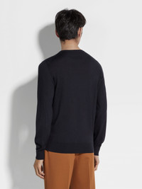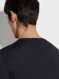 The navy blue mélange Cashseta crewneck brings together cashmere and silk. INFO Zegna's refined blend of cashmere and silk lends the navy blue mélange Cashseta crewneck its distinctive finish. The natural knit feels soft against the skin, elevating a simple design into a luxurious essential. The classic ribbed collar and trims complete the look. Customize this item with our Made to Measure Service. For more information, please contact our Customer Care or visit your nearest stores. PRODUCT CODE E8J00-110-B98 MATERIALS AND CARE 70% Cashmere; 30% Mulberry Silk This sophisticated fabric combines the softness of cashmere with the smooth finish of fine silk. The yarns of Cashseta are dyed before the fabric is created, resulting in a mélange that is unique to each garment. Do not wash. Do not bleach. Do not tumble dry. Iron at max 110°C. Professional dry cleaning in hydrocarbons. FIT AND PRODUCT DETAILS • 18 gauge • Ribbed crewneck collar • Long sleeves • Ribbed hem and cuffs • Regular fit • Model is 188 cm tall (6.2 feet) and wears an Italian size 48.