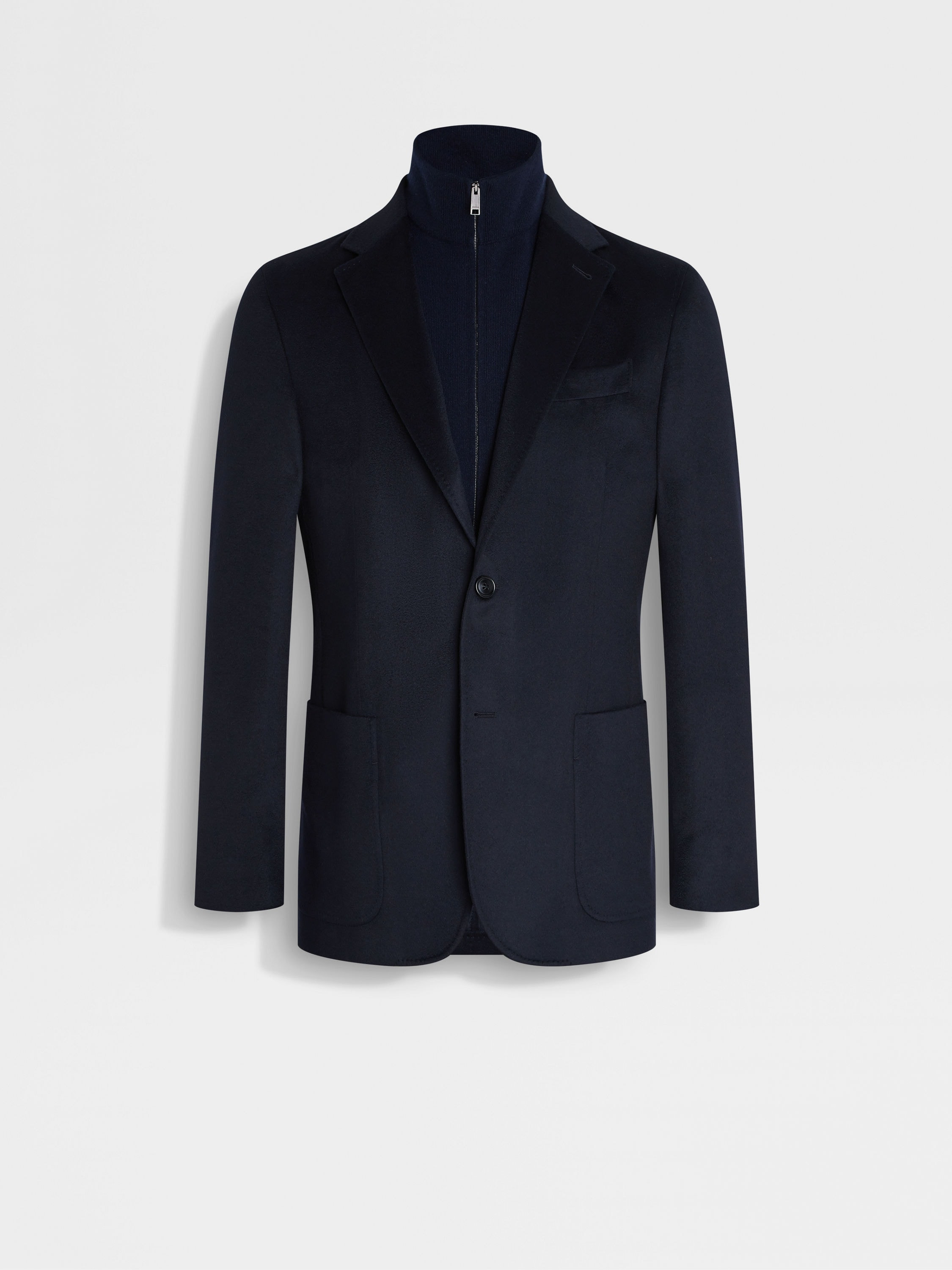 This navy blue Oasi Cashmere jacket features a detachable bib for endless versatility. INFO Showcasing ZEGNA's vision of quiet luxury, refined elegance and effortless functionality, this navy blue Oasi Cashmere jacket is made from one of the brand's most exclusive natural fibers. Styled with classic notch lapels, it features a detachable knit bib and roomy patch pockets. PRODUCT CODE UGC46A2-DYR-B09 MATERIALS AND CARE Main body: 100% Cashmere Leather details: Calfskin Lining: 53% Cotton; 47% Cupro The inspiration behind this Oasi Cashmere collection garment was born in Oasi Zegna, a 100km² natural territory and the home of our values. It's crafted from Oasi Cashmere fibres, made with 100% certified traceable fibres. The Oasi Cashmere collection follows in the footsteps of our Founder, who envisioned a vertically integrated system of producing textiles. Do not wash. Do not bleach. Do not tumble dry. Iron at max 110°C. Professional dry cleaning in hydrocarbons, mild process. Protect leather details before washing. Do not iron leather details. FIT AND PRODUCT DETAILS • Regular fit • Notch lapels • Detachable bib in knit Oasi Cashmere • Leather details • Button closure • Patch pockets • 73,5 cm length on size 48