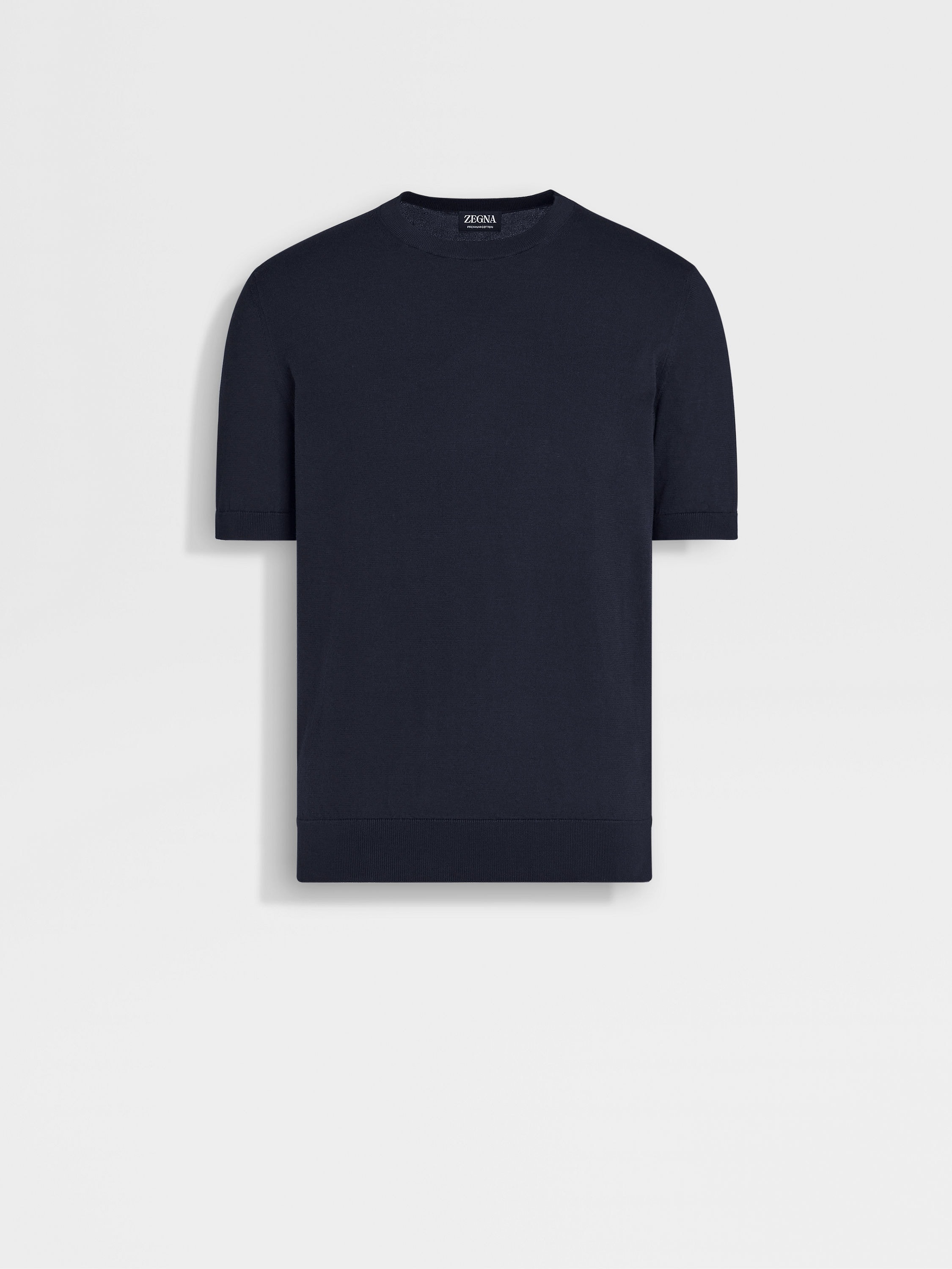 The navy blue Premium Cotton crewneck T-shirt is made from specially selected, extra-long cotton fibers. INFO Superior materials make all the difference in the navy blue Premium Cotton crewneck. The short-sleeve T-shirt's finely knit fabric is luxuriously soft, resilient, and breathable. This elevated essential is finished off with the classic ribbed trims. PRODUCT CODE E8C90A7-C10-B09 MATERIALS AND CARE 100% Cotton Only long-staple fibres are used to create the Premium Cotton yarns of this garment, imbuing it with strength, softness and durability — ideal for bringing a luxurious feel to everyday looks. Wash by hand. Do not bleach. Do not tumble dry. Flat drying. Iron at max 110°C. Professional dry cleaning in hydrocarbons, mild process. Wash and iron inside out. FIT AND PRODUCT DETAILS • 18 gauge • Ribbed crewneck collar • Short sleeves • Ribbed hem and cuffs • Regular fit • Model is 185 cm tall (6.0 feet) and wears an Italian size 48.