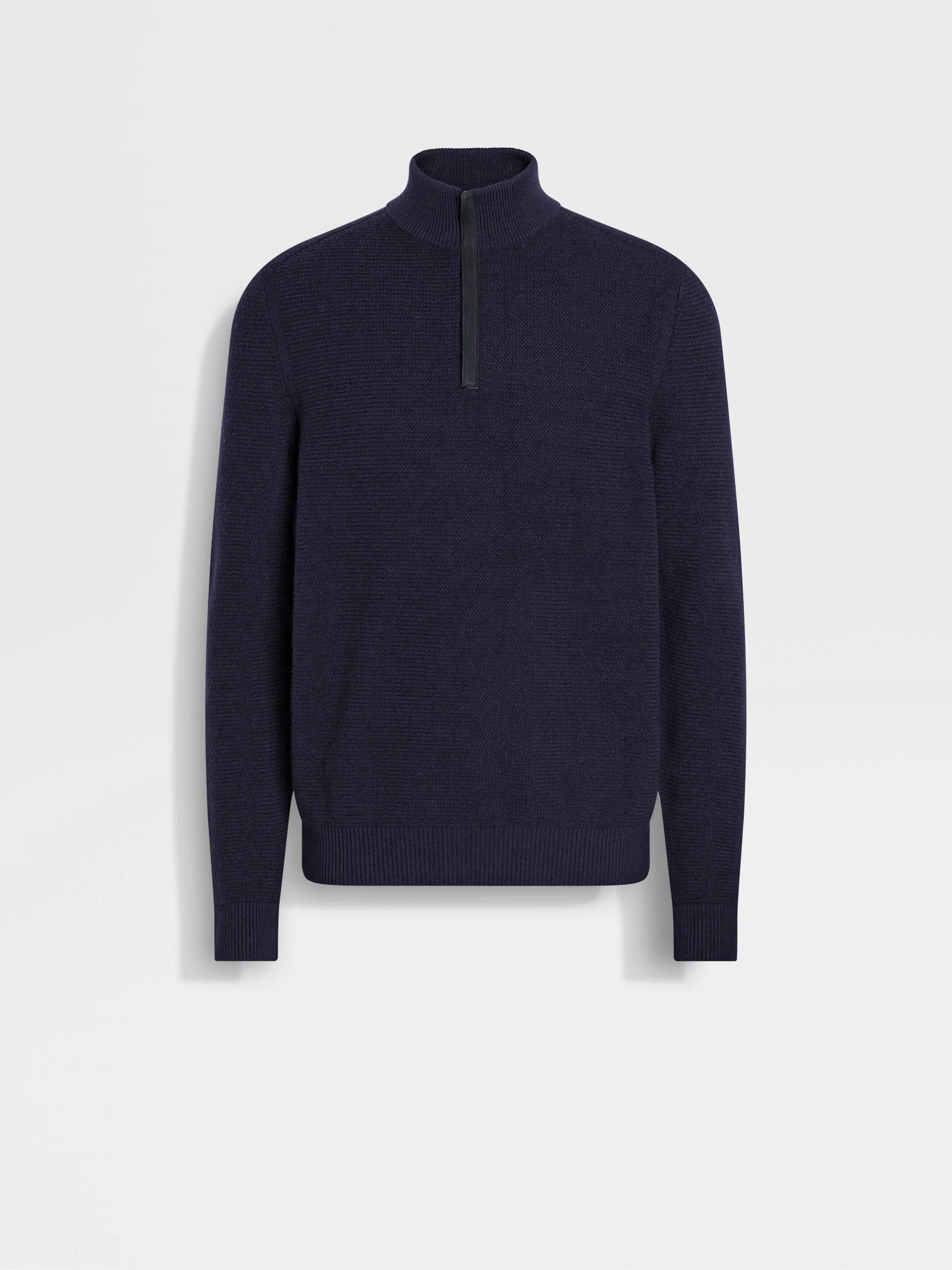 Fine wool and timeless elegance: this navy blue Vellus Aureum mock neck is the definition of everyday luxury. INFO This wool mock neck pays homage to the authentic beauty of natural materials, knitted from ZEGNA's exquisite Vellus Aureum. Refined leather details elevate its navy blue colorway, while a zip closure ensures endless versatility. PRODUCT CODE UGA01A2-VELARM-B09 MATERIALS AND CARE 100% Wool Vellus Aureum was inspired by our Founder’s quest for excellence to seek the finest wool in the world. Exquisitely fine in texture and rare, Vellus Aureum is crafted from 100% certified traceable wool fibres. Wash by hand. Do not bleach. Do not tumble dry. Flat drying. Iron at max 110°C. Professional dry cleaning in hydrocarbons, mild process. Wash and iron inside out. Protect buttons before cleaning. FIT AND PRODUCT DETAILS • Regular fit • Seed stitch knit • 14 gauge • Ribbed stand collar • Long sleeves • Ribbed hem and cuffs • Zip closure • Leather details