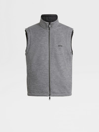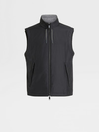 The nylon reversible vest is designed for both performance and versatile style. INFO Choose between the black and grey nylon reversible vest's two sides to suit different moods: resilient microfiber or a soft, cashmere blend jersey. The stand collar and adjustable hem block out the wind, while keeping the look sleek and streamlined. The vest fastens with a zipper and leather drawstrings. Customize this item with our Made to Measure Service. For more information, please contact our Customer Care or visit your nearest stores. PRODUCT CODE E7T33-7110B-001 MATERIALS AND CARE Main body: 100% Polyester Leather details: Calfskin Do not wash. Do not bleach. Do not tumble dry. Iron at max 110°C. Professional dry cleaning in hydrocarbons, mild process. Professional leather clean only. Protect leather details before washing. Protect the metal accessories during washing. FIT AND PRODUCT DETAILS • Regular fit • Side A: microfiber • Side B: cashmere blend jersey • Stand collar • Zip closure • Adjustable hem • Leather drawstrings • Zegna Logo • Welt pockets • Water repellent • 64 cm length on size 48 • Model is 188 cm tall (6.2 feet) and wears an Italian size 48.