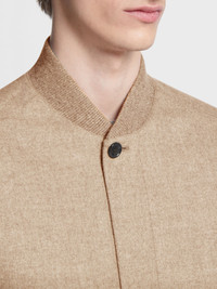 The light taupe Oasi Cashmere Elements padded blouson enhances luxurious natural materials with a water-repellent membrane. INFO Slightly felted for textured appeal, Zegna's exclusive, extra-fine cashmere gives the light taupe Oasi Cashmere Elements padded blouson its beautifully soft finish. The jacket is equipped with extra padding and a water-repellent membrane that preserves these qualities while adding even more protection. This sporty design is finished off with a ribbed bomber collar and ribbed cuffs to match. PRODUCT CODE UCT45A6-C119-139 MATERIALS AND CARE Main body: 100% Cashmere Leather details: Calfskin Lining: 100% Polyester Padding: 100% Polyester This Oasi Cashmere Collection garment is crafted from soft cashmere that's specially treated with a breathable water-resistant membrane — a tribute to our founder's legacy of textile innovation. Do not wash. Do not bleach. Do not tumble dry. Iron at max 110°C. Professional dry cleaning in hydrocarbons, mild process. Professional leather clean only. Protect leather details before washing. Protect the metal accessories during washing. FIT AND PRODUCT DETAILS • Regular fit • Ribbed bomber collar • Zip and button closure • Half-ribbed hem • Ribbed cuffs • Leather details • Slightly felted fabric • Side straight pockets with concealed snap buttons • Polyester padding • Water repellent • 64 cm length on size 48
