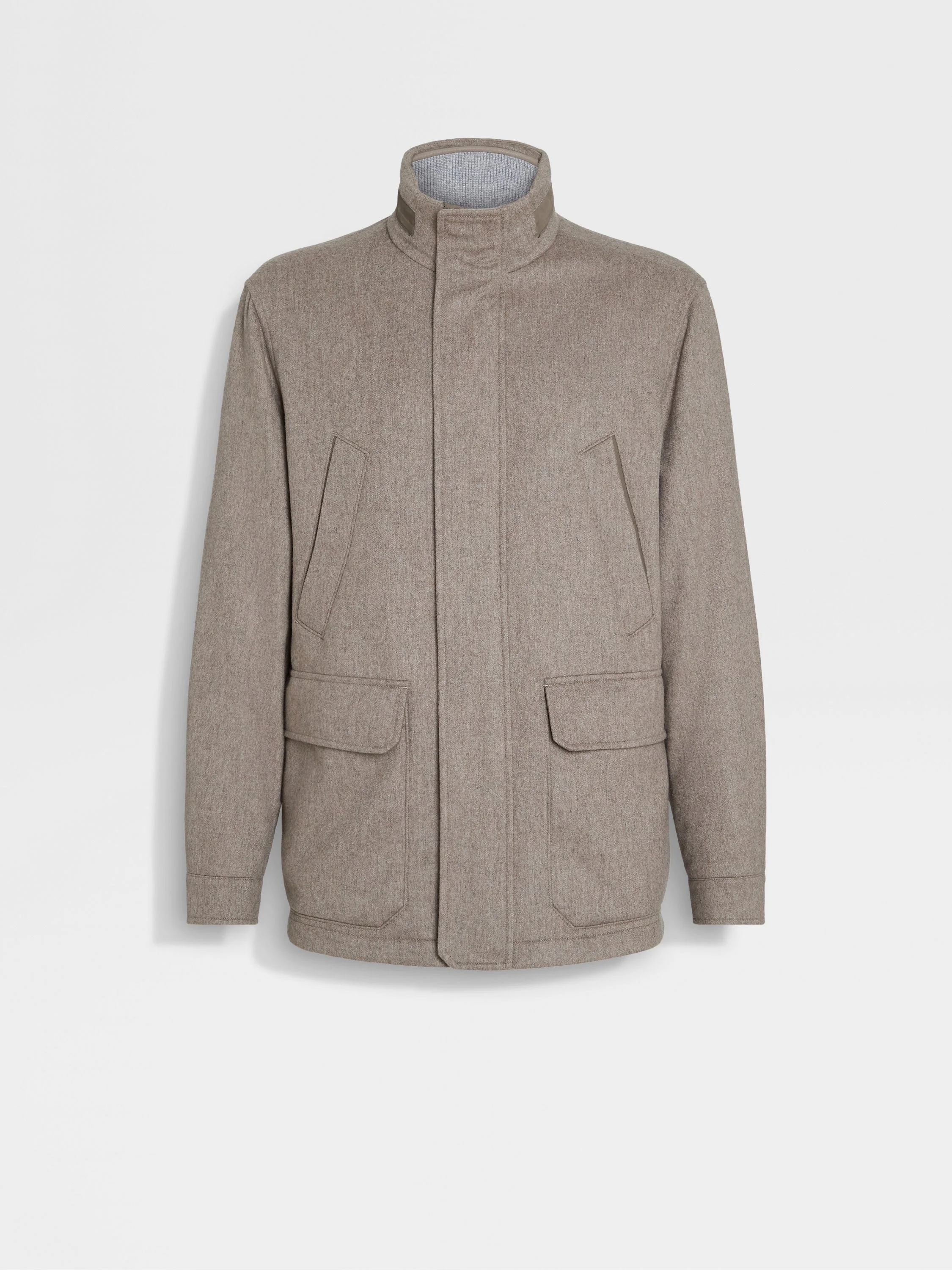The light taupe multimelange Oasi Cashmere Elements car coat is made from natural fibers enhanced with a water-repellent membrane. INFO The light taupe multimelange Oasi Cashmere Elements car coat features a lush colorway for even more dimension. The classic car coat silhouette is padded for extra warmth and equipped with a hood that folds into the stand collar. Leather details add a final accent. PRODUCT CODE UET41A8-E202-N92 MATERIALS AND CARE Main body: 100% Cashmere Lining: 89% Wool; 6% Mulberry Silk; 5% Cashmere Leather details: Calfskin Padding: 100% Polyester This Oasi Cashmere Collection garment is crafted from soft cashmere that's specially treated with a water repellent finish — a tribute to our founder's legacy of textile innovation. We commit to certifying Oasi Cashmere fibres as 100% traceable from 2024. Do not wash. Do not bleach. Do not tumble dry. Iron at max 110°C. Professional dry cleaning in hydrocarbons, mild process. Professional leather clean only. Protect leather details before washing. FIT AND PRODUCT DETAILS • Regular fit • Stand collar with stowaway hood • Zip and button closure • Straight hem • Adjustable cuffs • Leather details • Flap patch pockets and slanted chest pockets • Polyester padding • Water repellent • 76 cm length on size 48