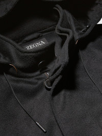 The Oasi Cashmere Elements Cima overjacket is an epitome of luxury outerwear. INFO Zegna's exclusive cashmere is made water-repellent using innovative technology, granting the black Oasi Cashmere Elements hooded Cima overjacket its exceptional weather resistance. The ultra-smooth finish of this luxury fabric elevates any adventure. Leather accents and meticulously crafted details complete the sleek design. The inspiration for the Cima Jacket, Cima the Italian word for 'Summit', was Born in Oasi Zegna — the home of our values in the Italian Alps. It's crafted from Oasi Cashmere fibers, which ZEGNA commits to certifying as traceable from 2024. The pinnacle of our outdoor-ready offering, wear it for warmth during revitalising hikes. Customize this item with our Made to Measure Service. For more information, please contact our Customer Care or visit your nearest stores. PRODUCT CODE E7T42-7210-001 MATERIALS AND CARE Main body: 100% Cashmere Leather details: Calfskin Lining: 100% Polyester This Oasi Cashmere Collection garment is crafted from soft cashmere that's specially treated with a breathable water-resistant membrane — a tribute to our founder's legacy of textile innovation. Do not wash. Do not bleach. Do not tumble dry. Iron at max 110°C. Professional dry cleaning in hydrocarbons, mild process. Professional leather clean only. Protect leather details before washing. Protect the metal accessories during washing. FIT AND PRODUCT DETAILS • Regular fit • Stand collar • Open hem • Zip and button closure • Welt pockets • Leather details and drawstring • Water repellent • 74 cm length on size 48 • Model is 190 cm tall (6.2 feet) and wears an Italian size 48.