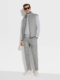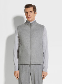The grey melange Oasi Cashmere Elements vest is lightly felted for a plush, touchable finish. INFO Sleek and functional, the grey melange Oasi Cashmere Elements vest is a versatile addition to any elevated wardrobe. Padded with warm goose down and feathers, this classic design is made water-repellent thanks to a Zegna's innovative technology: the exclusive cashmere fabric is enhanced with a special membrane. The zip-up vest is styled with a knit lining inside the stand collar. PRODUCT CODE UET45A8-E151-K95 MATERIALS AND CARE Main body: 100% Cashmere Leather details: Calfskin Lining: 100% Cotton Padding: 90% Goose Down; 10% Feather This Oasi Cashmere Collection garment is crafted from soft cashmere that's specially treated with a water repellent finish — a tribute to our founder's legacy of textile innovation. We commit to certifying Oasi Cashmere fibres as 100% traceable from 2024. Do not wash. Do not bleach. Do not tumble dry. Iron at max 110°C. Professional dry cleaning in hydrocarbons, mild process. Professional leather clean only. Protect leather details before washing. FIT AND PRODUCT DETAILS • Regular fit • Stand collar with knit lining • Zip closure • Open hem • Leather details • Straight welt pockets • Goose down and feather padding • Water repellent • Slightly felted fabric • 68 cm length on size 48