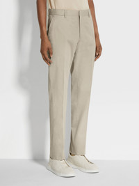 The off white stretch cotton pants are essential for the new world of work. INFO Perfect for travel and relaxed enough for work-from-home, the off white stretch cotton pants can easily be dressed up or down. The sleek flat front creates a flattering, streamlined silhouette, emphasizing their crisp lines. PRODUCT CODE E8I03-TR14-837 MATERIALS AND CARE Main body: 97% Cotton; 3% Elastane Lining: 100% Cotton Do not wash. Do not bleach. Do not tumble dry. Iron at max 110°C. Professional dry cleaning in hydrocarbons, mild process. Wash inside out. FIT AND PRODUCT DETAILS • Regular fit • 18.5 cm open hem • Flat front style • Hook, button and zip closure • Slanted pockets on the sides and back phone pocket • Model is 187 cm tall (6.1 feet) and wears an Italian size 48.