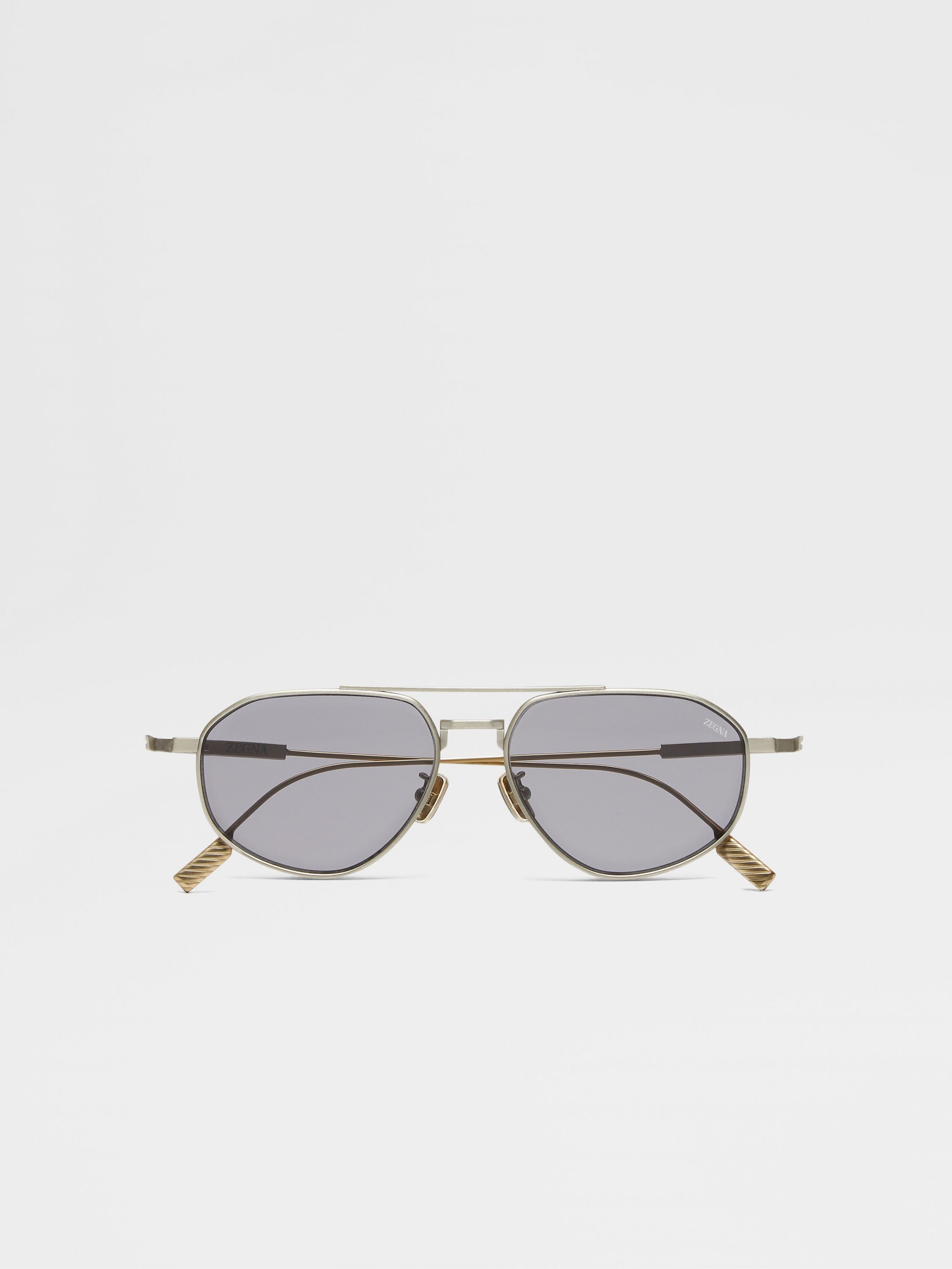 A navigator silhouette and light titanium construction make these satin palladium sunglasses an everyday hero. INFO Sleek, lightweight and comfortable, these navigator-style sunglasses are a must for modern everyday looks. Crafted from lightweight titanium in a satin palladium finish, they feel flexible on the face with beta-titanium "elbow" temples and stay put with high-grip paddle tips. Complete with light grey lenses and ZEGNA's signature 232 Road Brand Mark detail. PRODUCT CODE EZ0289-5617A MATERIALS AND CARE Full Titanium Clean your eyewear using a soft cloth, preferably microfiber, with water or a mild detergent. To avoid scratching the lenses, never use paper towels or clothing to clean your eyewear. Do not use household detergents or soaps to clean your eyewear; these products will damage the lenses over time. FIT AND PRODUCT DETAILS • Lens 56 mm – Bridge 16 mm – Temple 155 mm • Base 2 • Finishing: matte • Not suitable for mounting prescription lenses • Double bridge • Light grey lenses • Grip paddle on the end of the temples • Beta-titanium temples • Adjustable gold nosepads • ZEGNA 232 Road Brand Mark on the temples as a corner detail • ZEGNA Logo on the lens and on the inner side of the temples