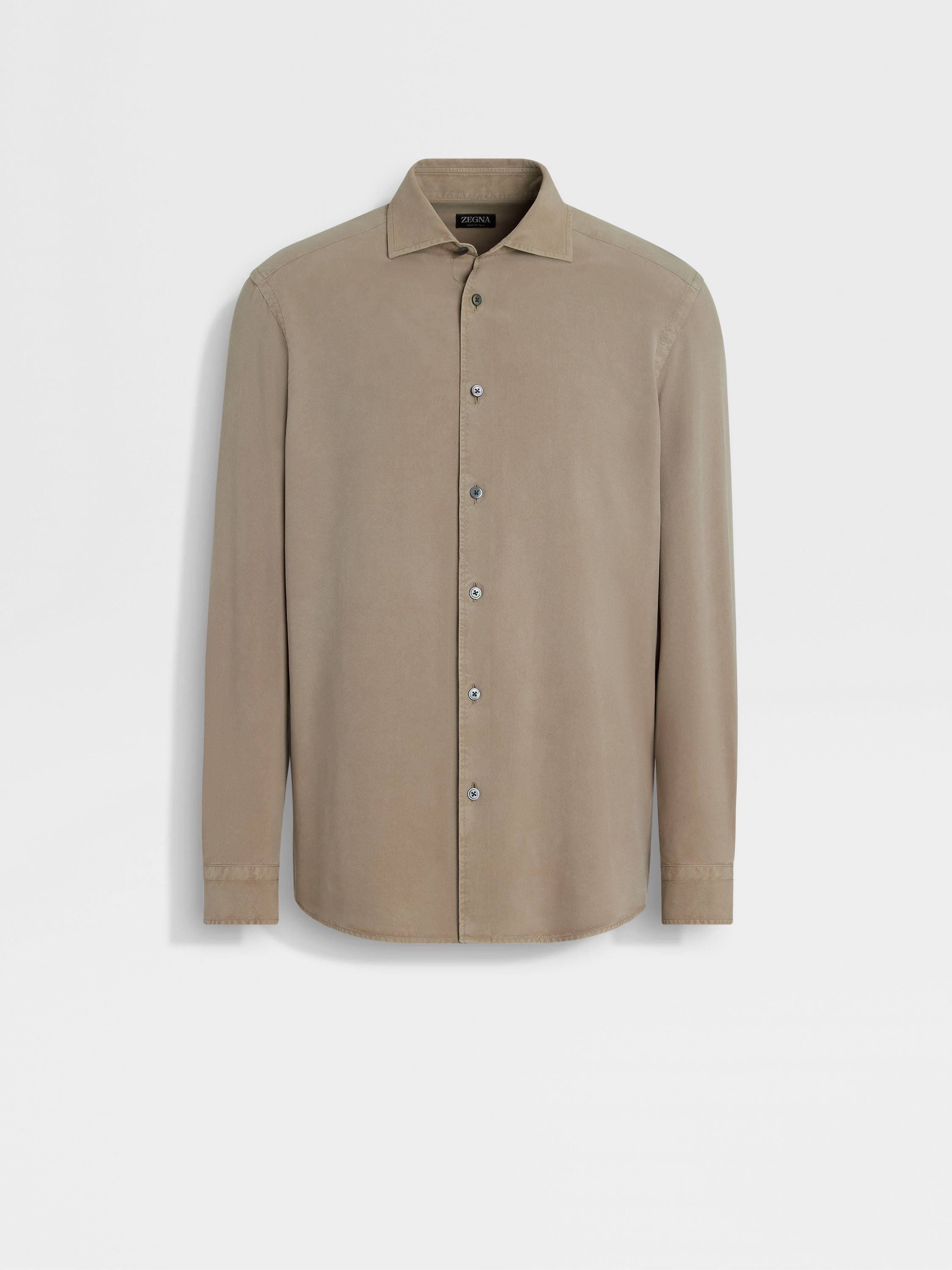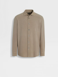 Pure silk in a refined light taupe hue: this shirt is the definition of luxury leisurewear. INFO Indulge in the luxurious allure of pure silk with this garment-dyed light taupe shirt. Its sleek long-sleeve silhouette is styled with a semi-spread collar, standard cuffs and a crisp straight hem. PRODUCT CODE UFX42A9-SLF5-N02 MATERIALS AND CARE 100% Mulberry Silk Wash by hand. Do not bleach. Do not tumble dry. Iron at max 110°C. Professional dry cleaning in tetrachloroethene and hydrocarbons. FIT AND PRODUCT DETAILS • Regular fit • Semi-spread collar • Standard cuffs • Button closure • Straight hem • Garment-dyed • 80 cm length on size 39