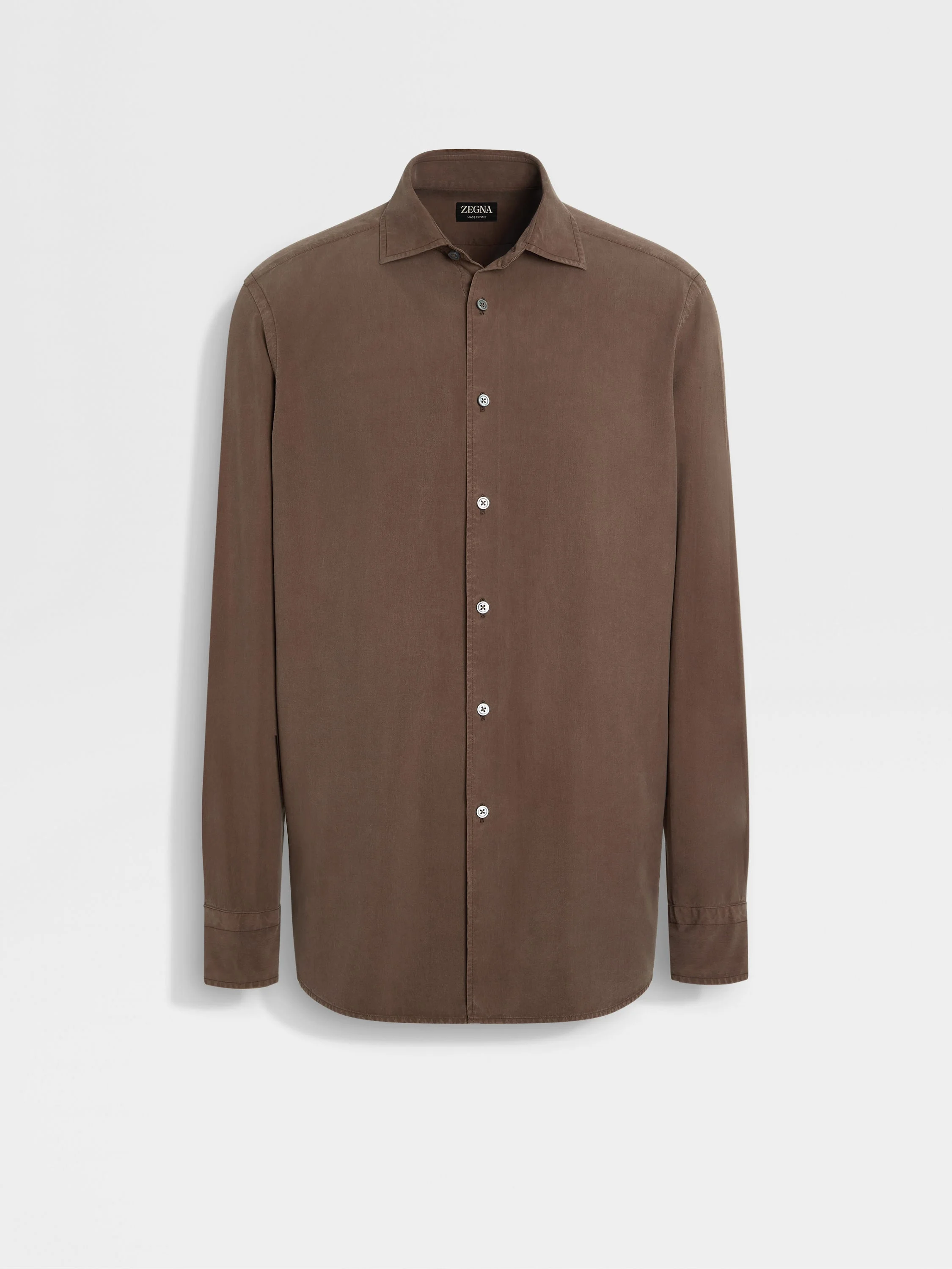 This brown shirt elevates the long-sleeve icon to luxury status in pure Mulberry silk. INFO Indulge in the luxurious allure of pure silk with this garment-dyed brown shirt. A semi-spread collar, standard cuffs and a crisp straight hem define the clean lines of its long-sleeve silhouette. PRODUCT CODE UGX42A2-SLF5-M06 MATERIALS AND CARE 100% Mulberry Silk Wash by hand. Do not bleach. Do not tumble dry. Iron at max 110°C. Professional dry cleaning in tetrachloroethene and hydrocarbons. FIT AND PRODUCT DETAILS • Regular fit • Semi-spread collar • Standard cuffs • Button closure • Rounded hem • Garment-dyed • Shirt gusset • 80 cm length on size 39 • Model is 185 cm tall (6.1 feet) and wears an Italian size 39.