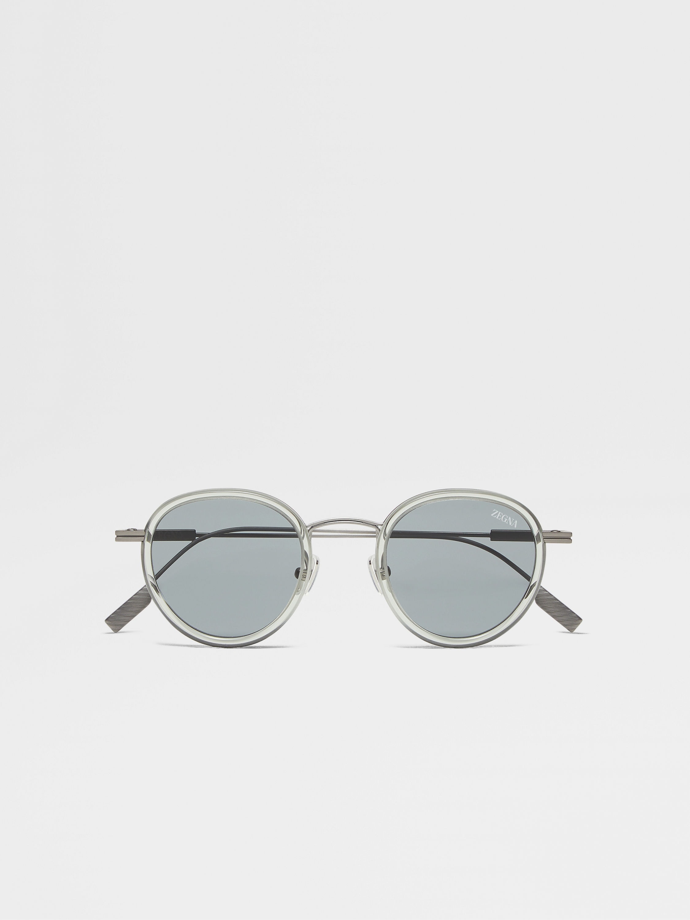 Sleek titanium lets the clean silhouette of these transparent light green sunglasses do all the talking. INFO These transparent light green sunglasses deliver lightweight comfort with a special construction that draws on the noble properties of flexible titanium: thin metal wire wraps around square-cut acetate with soft rounded volumes. Adjustable nose pads and grip paddles on the temple tips ensure a secure fit, whilst our iconic 232 Road Brand Mark signs off the looks with Zegna's signature elegance. PRODUCT CODE EZ0276-4693A MATERIALS AND CARE Titanium; Acetate Clean your eyewear using a soft cloth, preferably microfiber, with water or a mild detergent. To avoid scratching the lenses, never use paper towels or clothing to clean your eyewear. Do not use household detergents or soaps to clean your eyewear; these products will damage the lenses over time. FIT AND PRODUCT DETAILS • Lens 46 mm – Bridge 23 mm – Temple 145 mm • Base 2 • Finishing: shiny • Single bridge • Laser-inscribed Zegna Logo on the inside of the temple and on the lens • Zegna 232 Road Brand Mark on the temples • Adjustable nose pads