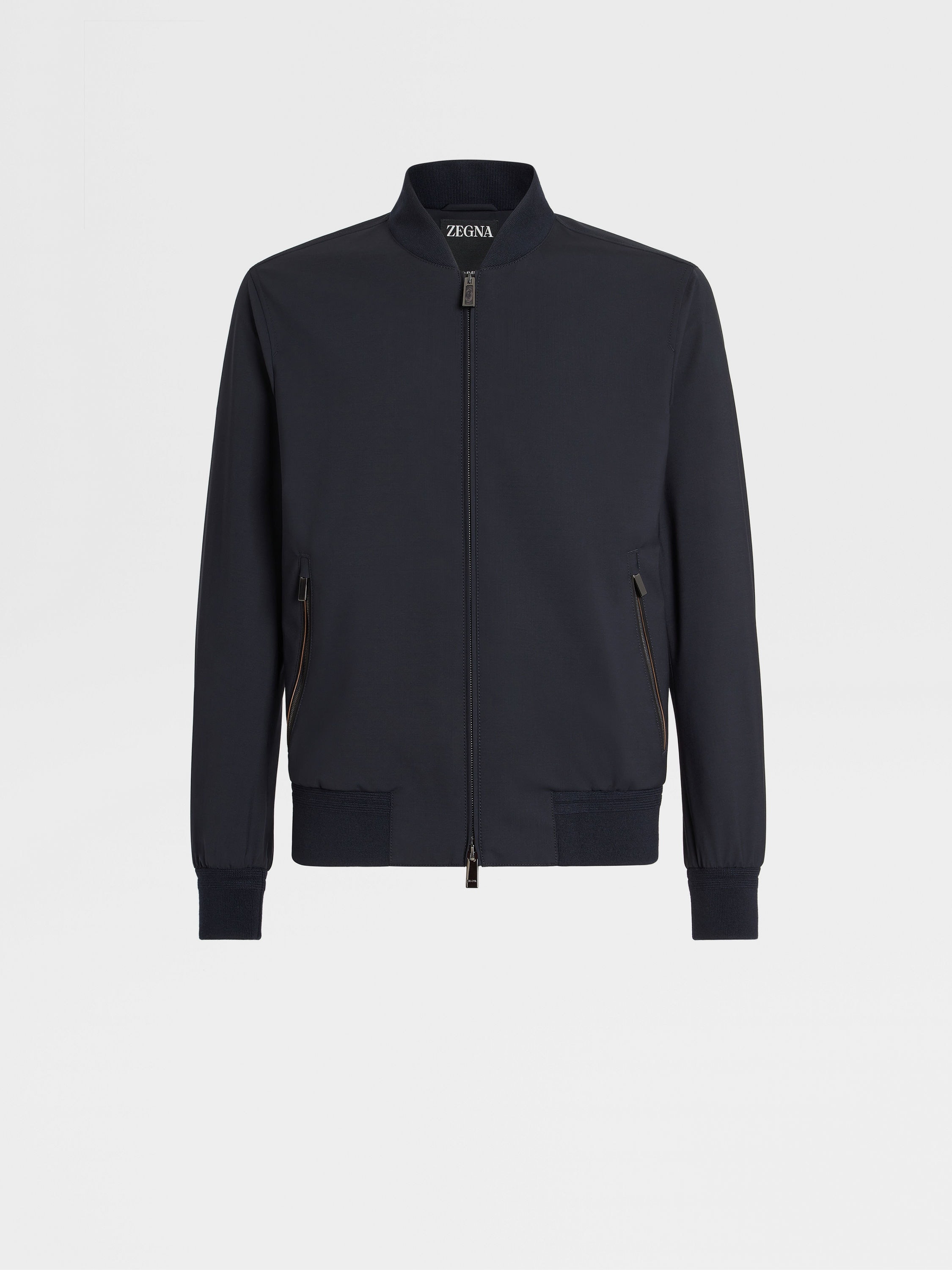 The navy blue Trofeo™ Elements wool bomber combines luxury materials with high-per... INFO Padded for extra warmth, the navy blue Trofeo™ Elements wool bomber is made from one of Zegna's most innovative materials: specially selected wool fibers are equipped with a water-repellent membrane to create a soft, lightweight, but very weather-resistant choice of outerwear. The classic bomber silhouette is finished off with a stand collar and ribbed trims. PRODUCT CODE E7T20-7100-531 MATERIALS AND CARE Main body: 100% Wool Leather details: Calfskin Lining: 100% Polyester The super-fine fabric of this luxurious garment features an innovative membrane that's specifically developed to ensure water resistance without compromising its natural softness and light weight. Do not wash. Do not bleach. Do not tumble dry. Iron at max 110°C. Professional dry cleaning in hydrocarbons, mild process. Professional leather clean only. Protect leather details before washing. Protect the metal accessories during washing. FIT AND PRODUCT DETAILS • Regular fit • Stand collar • Zip closure • Ribbed hem • Leather details • Zipped pockets • Water repellent • 66 cm length on size 48 • Model is 187 cm tall (6.1 feet) and wears an Italian size 48.