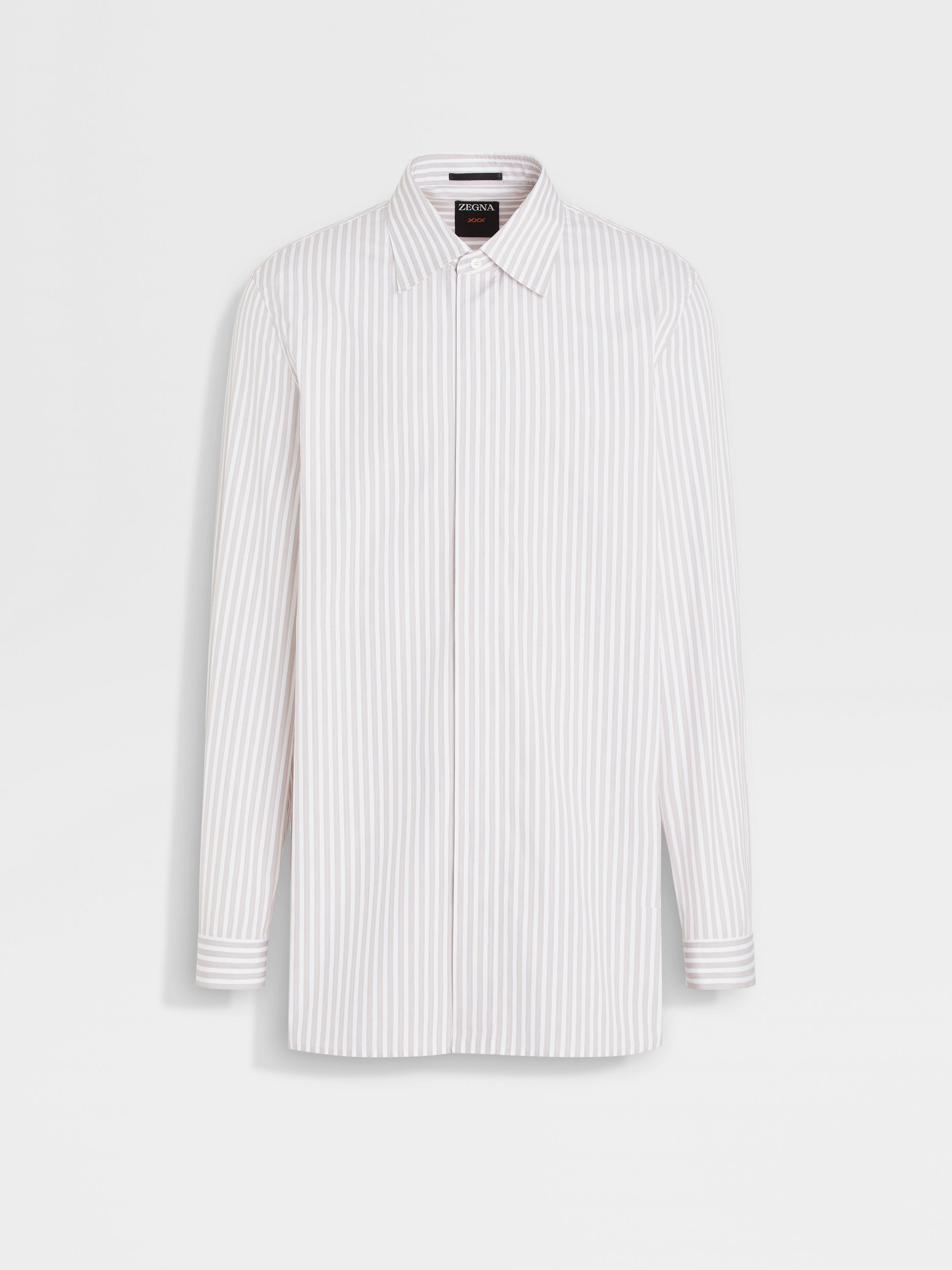 This white and brown macro-striped shirt is made from ultra-soft Centoventimila cotton. INFO This long-sleeved shirt with spread collar is crafted from ZEGNA's exclusive Centoventimila cotton for a smooth, lightweight feel. Styled with a macro-striped pattern in a charming white and brown palette, it features a concealed placket for a sleek, streamlined look. PRODUCT CODE 287210A2-9SSBC2 MATERIALS AND CARE 100% Cotton Centoventimila – Italian for 120,000 – is named after its high thread count. Garments crafted from this fabric are extremely lightweight and have a soft, silk-inspired hand feel. Max washing temp 40°C. Do not bleach. Do not tumble dry. Iron at max 150°C. Professional dry cleaning in tetrachloroethene and hydrocarbons. FIT AND PRODUCT DETAILS • Regular fit • Tailoring shirt • Spread collar • Standard cuffs • Button closure with concealed placket • Folded pleat • Macro-striped pattern • 81 cm length on size 39
