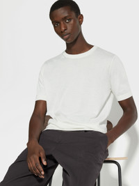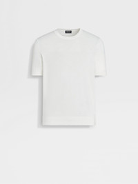 The white Premium Cotton crewneck T-shirt is made from specially selected, extra-long cotton fibers. INFO Superior materials make all the difference in the white Premium Cotton crewneck. The short-sleeve T-shirt's finely knit fabric is luxuriously soft, resilient, and breathable. This elevated essential is finished off with the classic ribbed trims. PRODUCT CODE E8C90A7-C10-N01 MATERIALS AND CARE 100% Cotton Only long-staple fibres are used to create the Premium Cotton yarns of this garment, imbuing it with strength, softness and durability — ideal for bringing a luxurious feel to everyday looks. Wash by hand. Do not bleach. Do not tumble dry. Flat drying. Iron at max 110°C. Professional dry cleaning in hydrocarbons, mild process. Wash and iron inside out. FIT AND PRODUCT DETAILS • 18 gauge • Ribbed crewneck collar • Short sleeves • Ribbed hem and cuffs • Regular fit • Model is 188 cm tall (6.2 feet) and wears an Italian size 48.