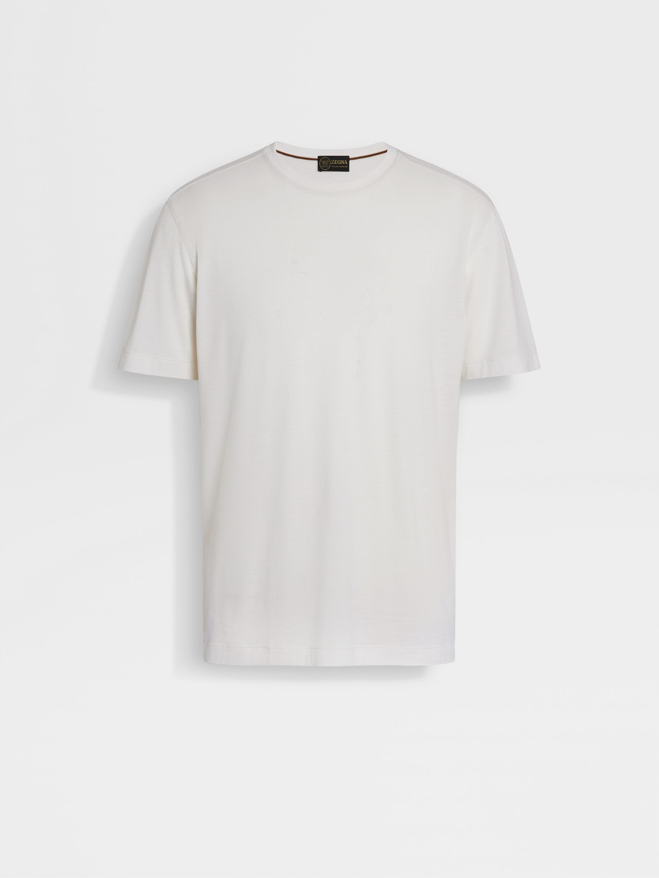 Introducing the white Vellus Aureum T-shirt. Exceptional softness meets understated style for everyday wear. INFO The white Vellus Aureum T-shirt reimagines a wardrobe staple through the lens of unique quality. Crafted from exceptionally fine wool, it offers softness and refinement. The regular fit, crewneck collar and short sleeves maintain a classic silhouette, while the tubular hem and cuffs ensure a clean finish. PRODUCT CODE UFV97A9-FV7VL8-N01 MATERIALS AND CARE 100% Wool Vellus Aureum was inspired by our Founder’s quest for excellence to seek the finest wool in the world. Exquisitely fine in texture and rare, Vellus Aureum is crafted from 100% certified traceable wool fibres. Do not wash. Do not bleach. Do not tumble dry. Iron at max 110°C. Professional dry cleaning in hydrocarbons. FIT AND PRODUCT DETAILS • Regular fit • Short sleeves • Crewneck collar • Tubular hem and cuffs