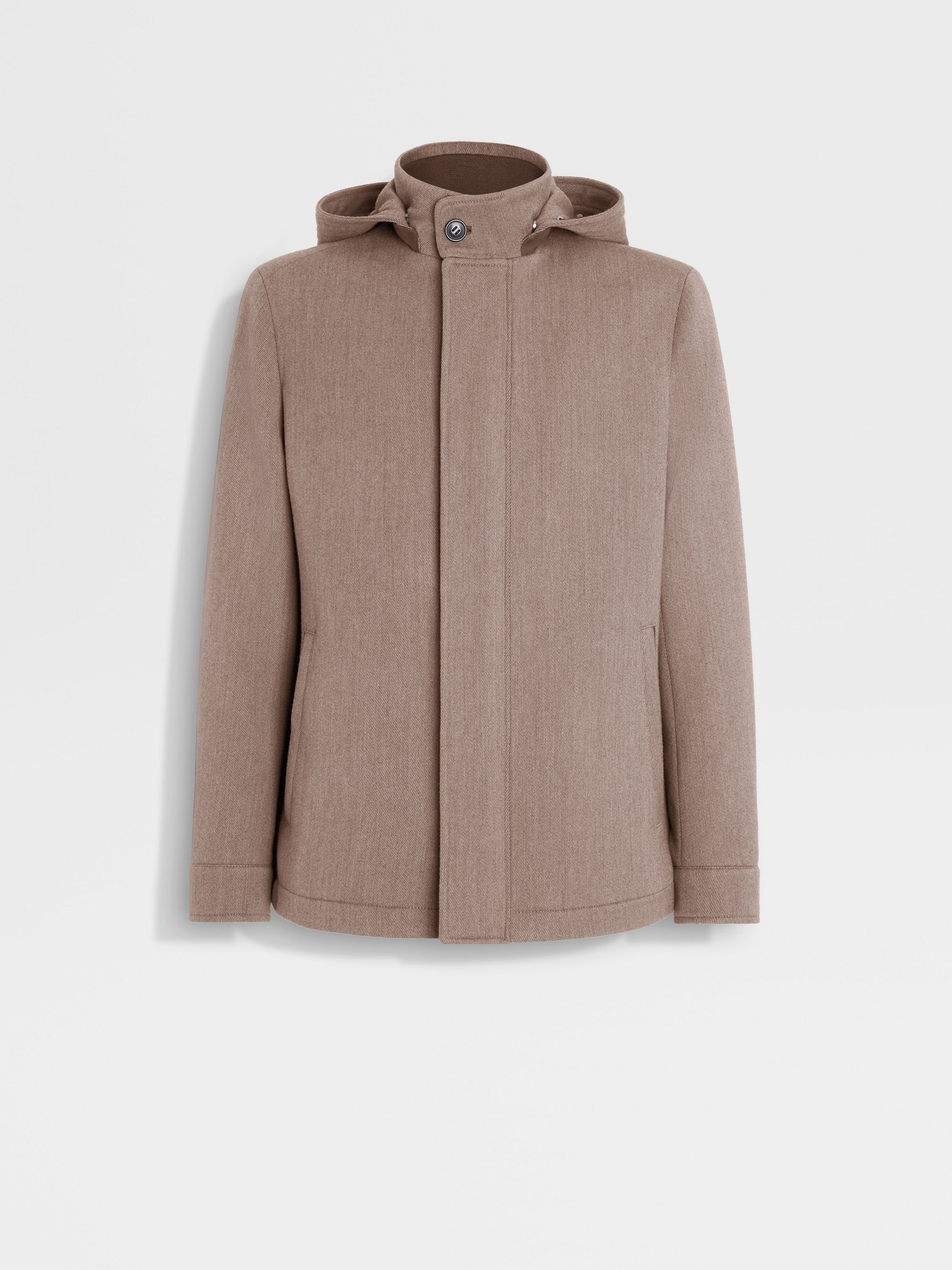 This brown melange jacket combines the best of wool and cashmere. INFO Functional, refined and versatile in equal measure, this brown melange jacket is styled with an adjustable hem and drawstring waist. Crafted from a luxurious blend of wool and cashmere with a water-repellent finish. PRODUCT CODE UGT24A2-G200-M96 MATERIALS AND CARE Main body: 98% Wool; 2% Cashmere Leather details: Calfskin Lining: 89% Wool; 6% Mulberry Silk; 5% Cashmere Do not wash. Do not bleach. Do not tumble dry. Iron at max 110°C. Professional dry cleaning in hydrocarbons, mild process. FIT AND PRODUCT DETAILS • Regular fit • Stand hooded collar • Zip and button closure • Adjustable hem • Leather details • Waist drawstring • Welt pockets • Water repellent • 74 cm length on size 48