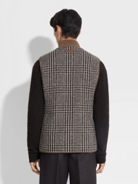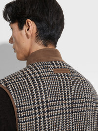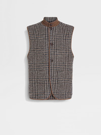 This brown, white and black Prince of Wales vest combines the best of wool and cashmere. INFO A refined blend of wool and cashmere provides a sublime backdrop for a charming brown, white and black Prince of Wales pattern with this deconstructed vest. A stand collar brings out its sporty side, while leather details add a sleek finish. PRODUCT CODE 287044A2-1G2PH0 MATERIALS AND CARE Main body: 90% Wool; 10% Cashmere Leather details: Calfskin Do not wash. Do not bleach. Do not tumble dry. Iron at max 110°C. Professional dry cleaning in tetrachloroethene and hydrocarbons, mild process. FIT AND PRODUCT DETAILS • Regular fit • Tailoring vest • Stand collar • Leather details • Pocket insert • Prince of Wales pattern • Button closure • Patch pockets • Deconstructed, fused • Lined • 72 cm length on size 48