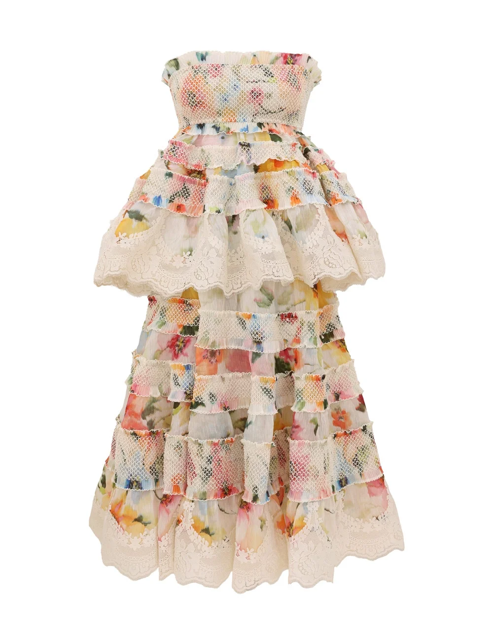 ITEM DETAILS The Alchemy Shirred Midi Dress in White Poppy from our Spring 2026 Collection, Kindred Spirit. A silk-linen midi dress featuring a bandeau neckline, spliced floral design, finished with a flared silhouette and tiered frills throughout. - Silk-linen organza fabric - Boning encased bodice - Detachable fabric straps - Peplum frill at the waist - Metal centre back zip closure - Smocking trims throughout - Lace trim at the hem - Lined Style Code: 7885DS262 SIZE DETAILS 0P 0 1 2 3 4 Length 35 38.5 38.5 38.5 38.5 38.5 Bust 23.5 25 27.5 29 31.5 33 Waist 24.5 26 27.5 30 32.5 34 Hip 37 39.5 41 43.5 45 47 Fitted bodice, relaxed through the skirt Heavy-weight, non-stretchy fabric This garment fits true to size Available in size 0P, suited to clients who are under 5'3"/ 160cm Model is 5'9.5"/178 cm, bust size 32C/10C and wears a size 0 Item measurements are in inches CARE INSTRUCTIONS Main: 55% linen, 45% silk; smocking: 100% polyester; lace: 100% polyester; crinoline: 100% polyester Dry clean only code f (hydrocarbon only); Remove any detachable trims prior to dry cleaning; Cover to protect trim; Iron in low temperature with protective cloth; Light steam only; Do not spot clean Always check the label or care card for specific care instructions.