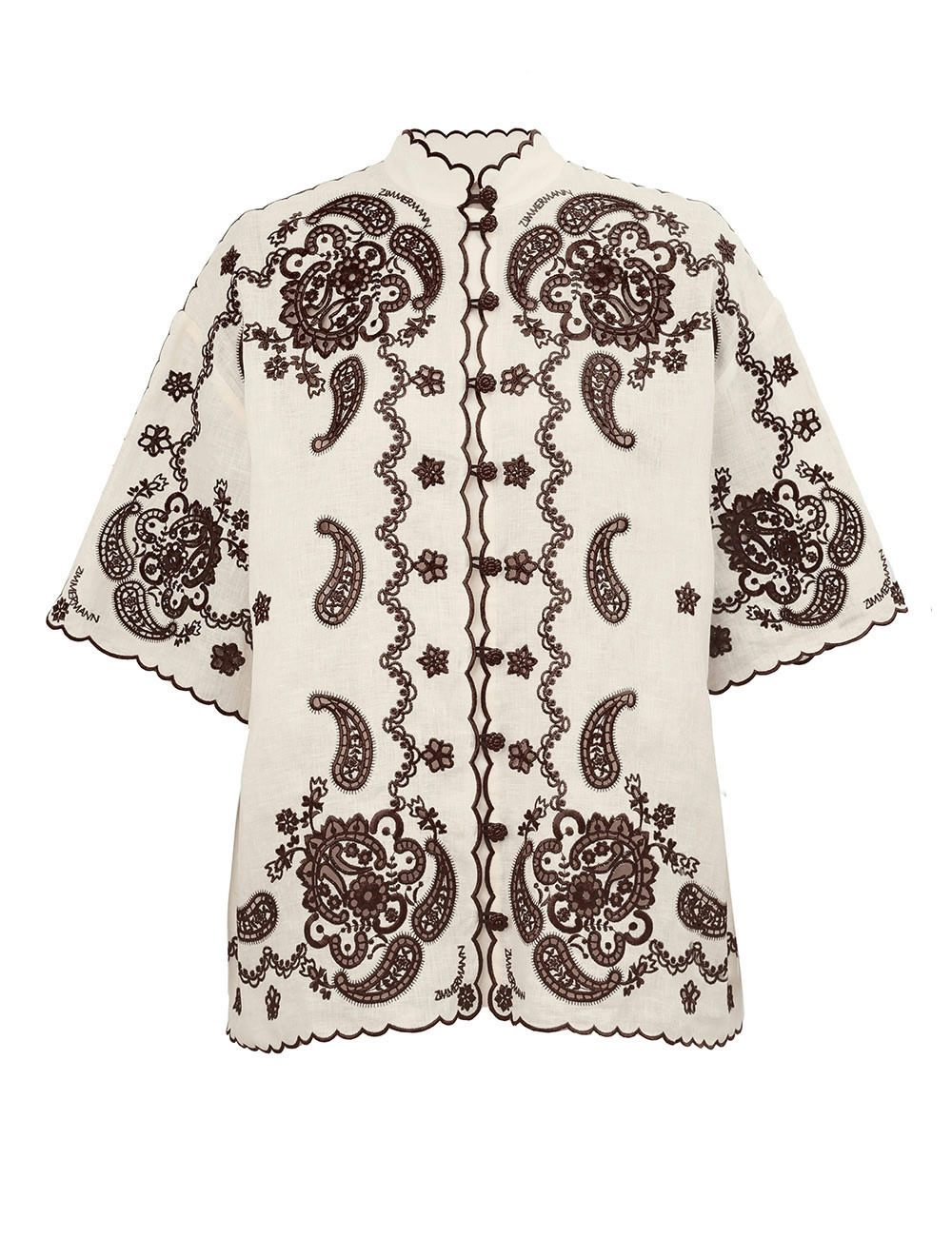 ITEM DETAILS The Ascension Embroidered Shirt in Ivory/Chocolate from our Summer Swim 2025 Collection. A linen shirt featuring embroidery detailing throughout with scalloped edges and self rouleau buttons down the centre front. - 100% linen fabric - Quarter sleeve shirt - Stand collar with scalloped edge - Flower crochet buttons down the centre front - Loose fit Campaign: This style was featured in the Summer Swim 2025 Campaign. Style Code: 3287TSS253 SIZE DETAILS 0P 0 1 2 3 Length 25.5 27 27.5 28 28 Sleeve 10 10.5 10.5 10.5 10.5 Designed for a relaxed fit This garment fits true to size Available in size 0P, suited to clients who are under 5'3"/ 160cm Model is 5'9.5"/178 cm, bust size 32C/10C and wears a size 0 Item measurements are in inches CARE INSTRUCTIONS Main: 100% linen, embroidery: 100% polyester Dry clean only code f (hydrocarbon only); Remove any detachable trims prior to dry cleaning; Cover to protect trim; Cool iron with protective cloth; Light steam only; Do not spot clean Always check the label or care card for specific care instructions.
