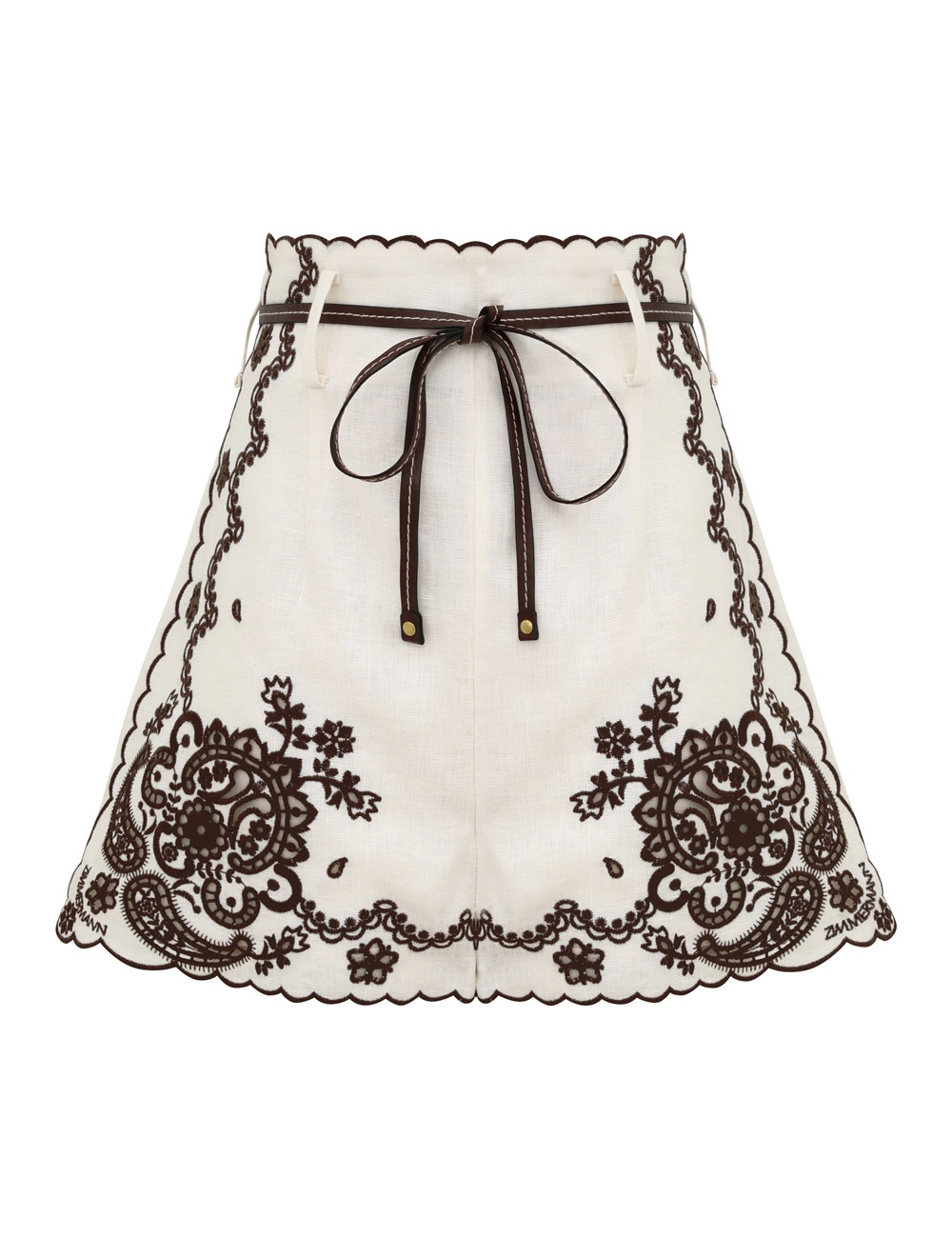 ITEM DETAILS The Ascension Embroidered Short in Ivory/Chocolate from our Summer Swim 2025 Collection. A high waisted linen short featuring a removable leather belt, scalloped edging and an invisible centre back zip closure. - 100% linen fabric - Belt loops with removable self tie belt - Invisible zip closure at centre back - Scalloped embroidery along the waist, sides and hem - Lined Campaign: This style was featured in the Summer Swim 2025 Campaign. Style Code: 3289ASS253 SIZE DETAILS 0P 0 1 2 3 Length 15 15.5 16 16.5 16.5 Waist 25 27 28.5 30.5 32.5 Hip 36 38.5 41 42.5 45 Inseam 2.5 2.5 2.5 2.5 2.5 Designed to be fitted at the waist and hips, relaxed through the legs Light-weight, non-stretchy fabric This garment fits true to size Available in size 0P, suited to clients who are under 5'3"/ 160cm Model is 5'9.5"/178 cm, bust size 32C/10C and wears a size 0 Item measurements are in inches CARE INSTRUCTIONS Main: 100% linen, lining: cotton, embroidery: 100% polyester Dry clean only code f (hydrocarbon only); Remove any detachable trims prior to dry cleaning; Cover to protect trim; Cool iron with protective cloth; Light steam only; Do not spot clean Always check the label or care card for specific care instructions.