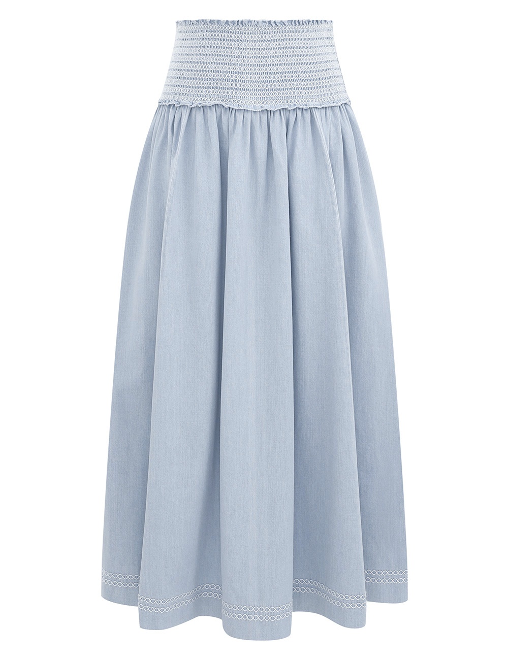 ITEM DETAILS The Ascension Shirred Denim Skirt in Ice Storm from our Summer Swim 2025 Collection. A denim midi skirt featuring a shirred waist yoke, frayed trim and relaxed, sheer skirt. - Denim midi skirt - Elasticated waistband with gathering - Frayed trim at waist and hem - Slip on style - Lined Style Code: 2725SSS253 SIZE DETAILS 0P 0 1 2 3 Length 29.5 32 32 32 32 Waist 24.5 26 27.5 30 31.5 Hip 29 30.5 33 34.5 37 Designed to be slightly fitted at the waist, loose at the hip This garment fits true to size Available in size 0P, suited to clients who are under 5'3"/ 160cm Model is 5'9.5"/178 cm, bust size 32C/10C and wears a size 0 Item measurements are in inches CARE INSTRUCTIONS 100% cotton Gentle cold machine wash separately with mild detergent; Remove any detachable trims prior to cleaning Cover to protect trim; Do not soak or bleach; Do not tumble dry; Dry in shade without delay; Cool iron with protective cloth; Do not spot clean; Dry cleanable code p Always check the label or care card for specific care instructions.