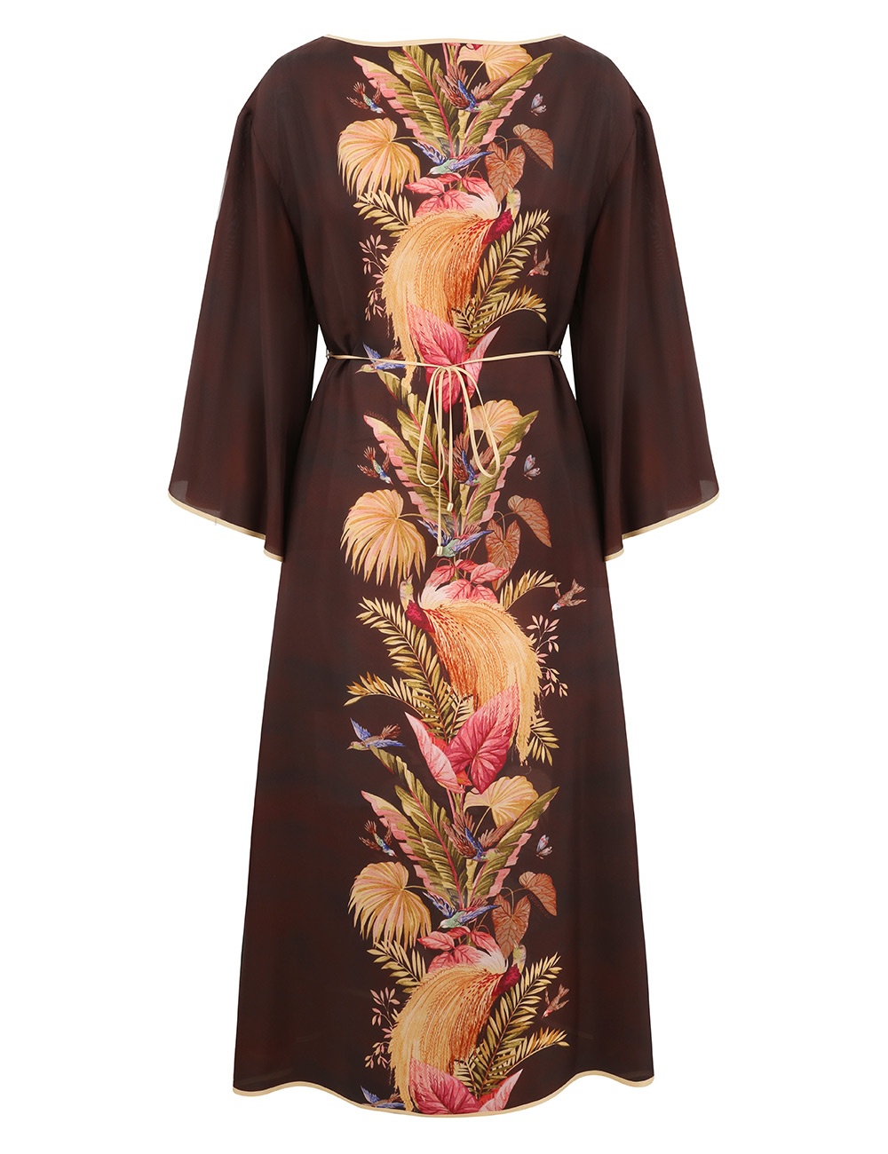 ITEM DETAILS The Ascension Tunic Midi Dress in Burgundy Palm Floral from our Summer Swim 2025 Collection. A silk tunic dress featuring wide sleeves, a high neckline and a self tie waist. - 100% silk habutae - Midi long sleeve dress - Boat neckline - Rouleau belt loop at side seam for removable waist belt - Bold placement print throughout Campaign: This style was featured in the Summer Swim 2025 Campaign. Style Code: 3417DSS253 SIZE DETAILS 0P 0 1 2 3 4 Length 45 49 49 49 49.5 50 Sleeve 16.5 17.5 17.5 17.5 17.5 17.5 Designed for a relaxed, loose fit This garment fits true to size Available in size 0P, suited to clients who are under 5'3"/ 160cm Model is 5'9.5"/178 cm, bust size 32C/10C and wears a size 0 Item measurements are in inches CARE INSTRUCTIONS Main: 100% silk Dry clean only code f (hydrocarbon only); Remove any detachable trims prior to dry cleaning; Cover to protect trim; Cool iron with protective cloth; Light steam only; Do not spot clean Always check the label or care card for specific care instructions.