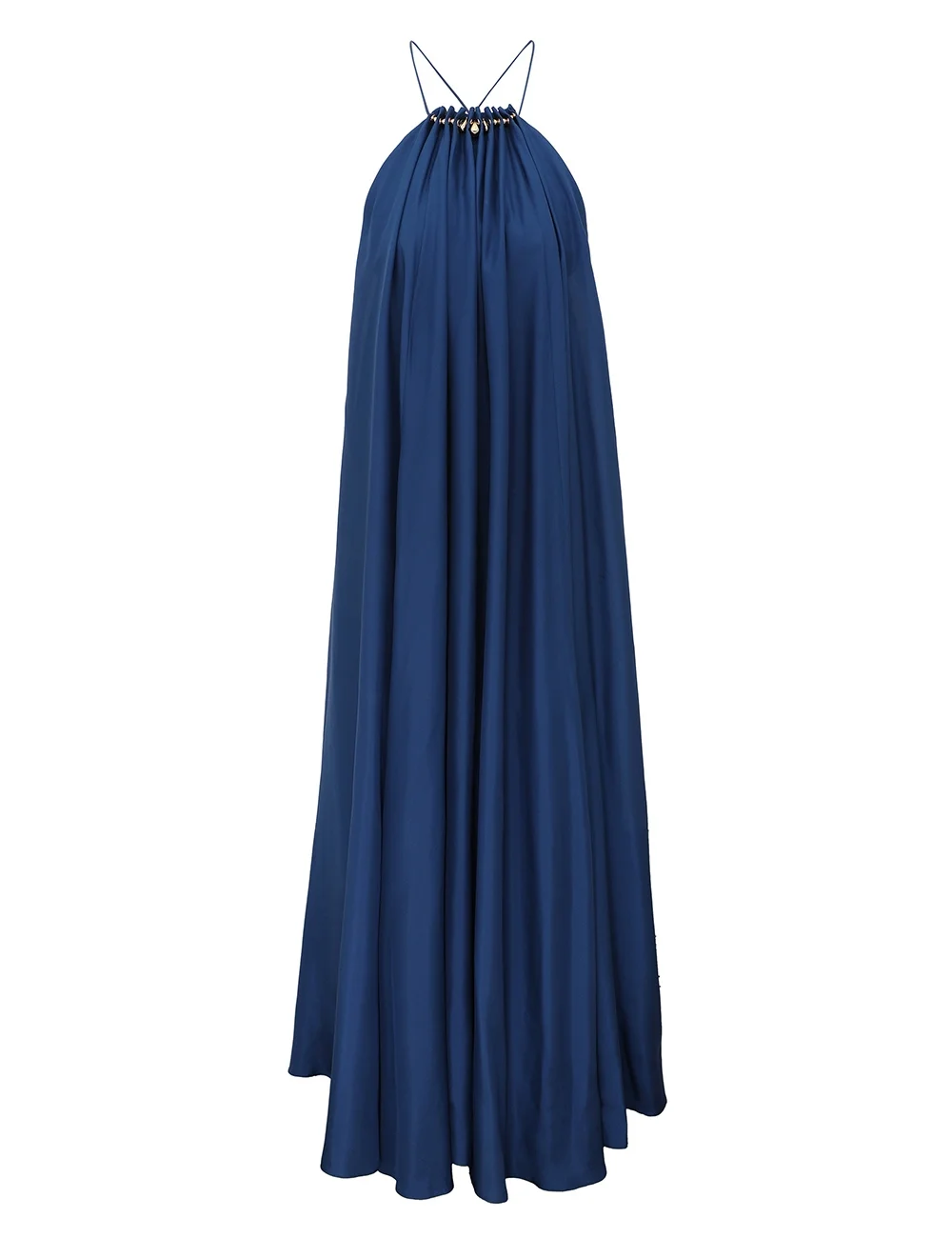 ITEM DETAILS The Aster Gathered Bead Maxi Dress in Dark Cobalt from our Summer Swim 2026 Collection. A silk maxi dress featuring a halter neckline with beaded trim, rouleau back straps, finished with heavy gathering throughout. - Silk fabric - Sleeveless, full-length dress - Threaded rouleau tie at neck - Criss-cross back straps with beaded ends - Exposed back with scoop dip - Lined Style Code: 8418DSS261 SIZE DETAILS 0P 0 1 2 3 4 Length 128 140 140 140 141 141 Self-tie back and neck, providing a flexible fit at the bust and waist This garment fits true to size Available in size 0P, suited to clients who are under 5'3"/ 160cm Model is 5'9.5"/178 cm, bust size 32C/10C and wears a size 0 Item measurements have been rounded to the nearest cm CARE INSTRUCTIONS Main: 100% silk; lining: 100% viscose Dry clean only code f (hydrocarbon only); Remove any detachable trims prior to dry cleaning; Cover to protect trim; Iron in low temperature with protective cloth; Light steam only; Do not spot clean Always check the label or care card for specific care instructions.