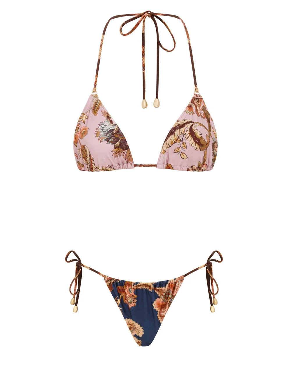 ITEM DETAILS The Aster Spliced Tri Bikini in Spliced from our Summer Swim 2026 Collection. A shiny bikini set featuring tie straps with toggle ends. - Triangle bra top with removable soft cups - Self-tie straps with toggle ends - Ruched front and back bottom for flexible coverage - Lined Style Code: 1839WSS261 SIZE DETAILS This garment fits true to size Model is 5'10.5"/179 cm, bust size 34C/12C and wears a size 0 CARE INSTRUCTIONS Main: 80% polyamide, 20% elastane; lining: 92% recycled nylon, 8% elastane Do not roll up when wet; Rinse immediately after use; Remove any detachable trims prior to washing; Cold hand wash separately with mild detergent, avoid fabric softener; Dry in shade; Do not bleach or iron; Do not tumble dry; Do not dry clean; Light colours may be transparent when wet; Avoid contact with sunscreens, oils, rough surfaces, and high temperature pools and spas; Always check the label or care card for specific care instructions.