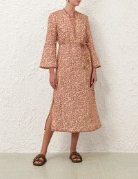 ITEM DETAILS The Awaken Braid Trim Midi in Tan Leopard from our Resort Swim 2026 Collection. A linen midi dress featuring a plunging V-neckline, long sleeves and partial side splits, finished with a removable waist belt. - Midi-length linen dress - Tunic silhouette - Self-tie braided belt - Side seam pockets - Long sleeves with wide cuffs - Braided trim detailing - Rouleau buttons across bust Style Code: 5824DRS261 SIZE DETAILS 0P 0 1 2 3 4 Length 46 49.5 50 50 50.5 51 Bust 35.5 37 39.5 41 43.5 45 Waist 36 38.5 40 42.5 44 46.5 Hip 40 42.5 44 46.5 48 50.5 Sleeve 20 21.5 22 22.5 22.5 23 Designed for a relaxed fit Mid-weight, non-stretchy fabric This garment fits true to size Available in size 0P, suited to clients who are under 5'3"/ 160cm Model is 5'9.5"/178 cm, bust size 32C/10C and wears a size 0 Item measurements are in inches CARE INSTRUCTIONS Main: 100% linen; pocketing: 100% cotton Dry clean only code f (hydrocarbon only); Remove any detachable trims prior to dry cleaning; Cover to protect trim; Iron in low temperature with protective cloth; Light steam only; Do not spot clean Always check the label or care card for specific care instructions.
