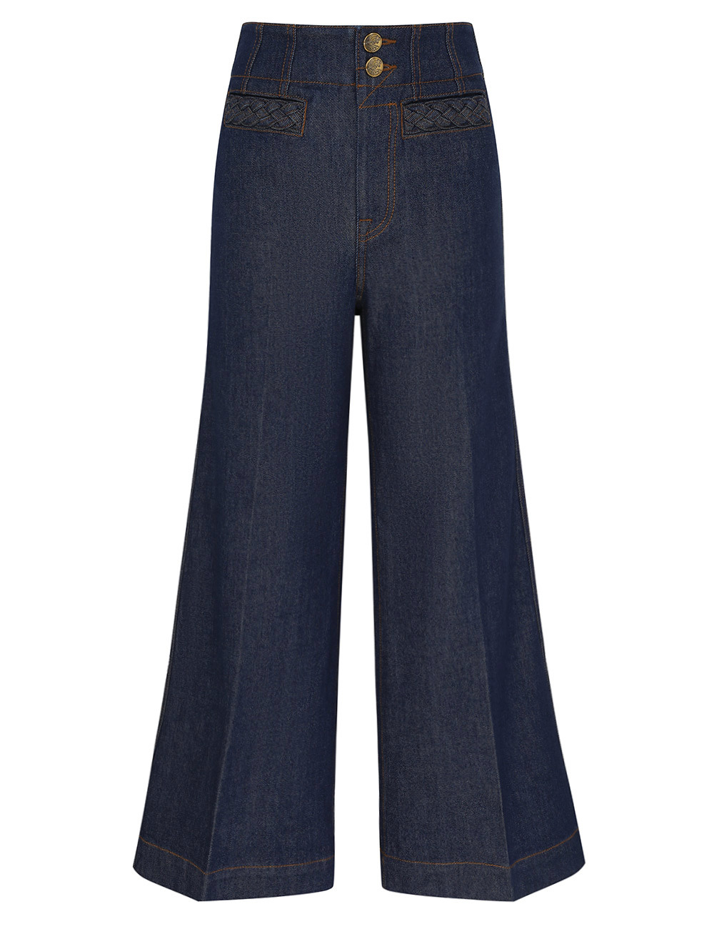 ITEM DETAILS The Awaken Denim Cropped Jean in Ink from our Resort Swim 2026 Collection. A denim cropped flare jean featuring button closure, functional back pockets and rope detail on centre front pockets. - Denim crop flare jean with wide hem - High-rise waist - Button closure at centre front - Rope detailing - Back welt pockets - Topstitching throughout Style Code: 6933PRS261 SIZE DETAILS Size=24 25 26 27 28 29 30 31 32 Length 37.5 38 38 38 38 38 Waist 23 23.5 24.5 24.5 25 27 Hip 34 34.5 35.5 36 38 38.5 Inseam 27 27 27 27 27 27 Slightly fitted at the waist, relaxed throughout High-rise waist with a cropped-length leg This garment fits true to size Model is 5'9.5"/178 cm, bust size 32C/10C and wears a size 26 Item measurements are in inches CARE INSTRUCTIONS Main: 82% cotton, 17% lyocell, 1% elastane; pocketing: 65% polyester, 35% cotton Gentle cold machine wash separately with mild detergent; Remove any detachable trims prior to cleaning Cover to protect trim; Do not soak or bleach; Do not tumble dry; Dry in shade without delay; Iron in low temperature with protective cloth; Do not spot clean; Dry cleanable code p Always check the label or care card for specific care instructions.