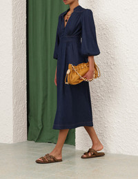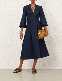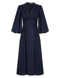 ITEM DETAILS The Awaken Denim Midi Dress in Ink from our Resort Swim 2026 Collection. A denim midi dress with a plunging V-neckline, long tubular sleeves with elasticated cuffs, finished with a fitted waistband and a flared skirt. - Denim midi-length dress - Deep V-neckline - Functional centre front buttons - Gathered throughout - Centre back metal zip closure - Pleated skirt Style Code: 7011DRS261 SIZE DETAILS 0P 0 1 2 3 4 Length 45.5 49.5 50 50 50.5 50.5 Bust 34.5 36 38.5 40 42.5 44 Waist 26 27.5 30 32.5 34 36 Hip 45.5 47 49.5 52 53.5 56 Sleeve 20.5 22 22.5 22.5 23 23 Slightly fitted at the bust and waist, loose at the hip Mid-weight, non-stretchy fabric This garment fits true to size Available in size 0P, suited to clients who are under 5'3"/ 160cm Model is 5'9.5"/178 cm, bust size 32C/10C and wears a size 0 Item measurements are in inches CARE INSTRUCTIONS 100% cotton Gentle cold machine wash separately with mild detergent; Remove any detachable trims prior to cleaning Cover to protect trim; Do not soak or bleach; Do not tumble dry; Dry in shade without delay; Iron in low temperature with protective cloth; Do not spot clean; Dry cleanable code p Always check the label or care card for specific care instructions.