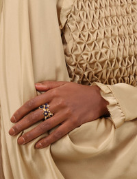 ITEM DETAILS The Bloom Band Ring in Gold/Blue from our Fall 2025 Collection, Hypnotic. A gold plated ring featuring a rich Sapphire blue stone set in an intricate cast setting. - 12KT gold plated brass - Glass Sapphire, white and green Cubic Zirconia - Intricate rope textured brass settings - Available in three sizes Style Code: 5202XF25A1 SIZE DETAILS Ring diameter: Ring diameter: Size 13: 6.5 Size 15: 7 Size 18: 7.5 Item measurements are in inches Size 13: 6.5 Size 15: 7 Size 18: 7.5 Item measurements are in inches CARE INSTRUCTIONS 50% brass 45% glass 5% cubic zirconia Zimmermann jewellery is made from 12kt gold-plated brass Please remove during exercising, showering or swimming Avoid contact with perfumes, acetones, creams, and water to prevent damage or discoloration Clean gently with a soft, lint-free cloth. Avoid cleaning products Store in a cool, dry place, away from direct sunlight and heat Always check the label or care card for specific care instructions.