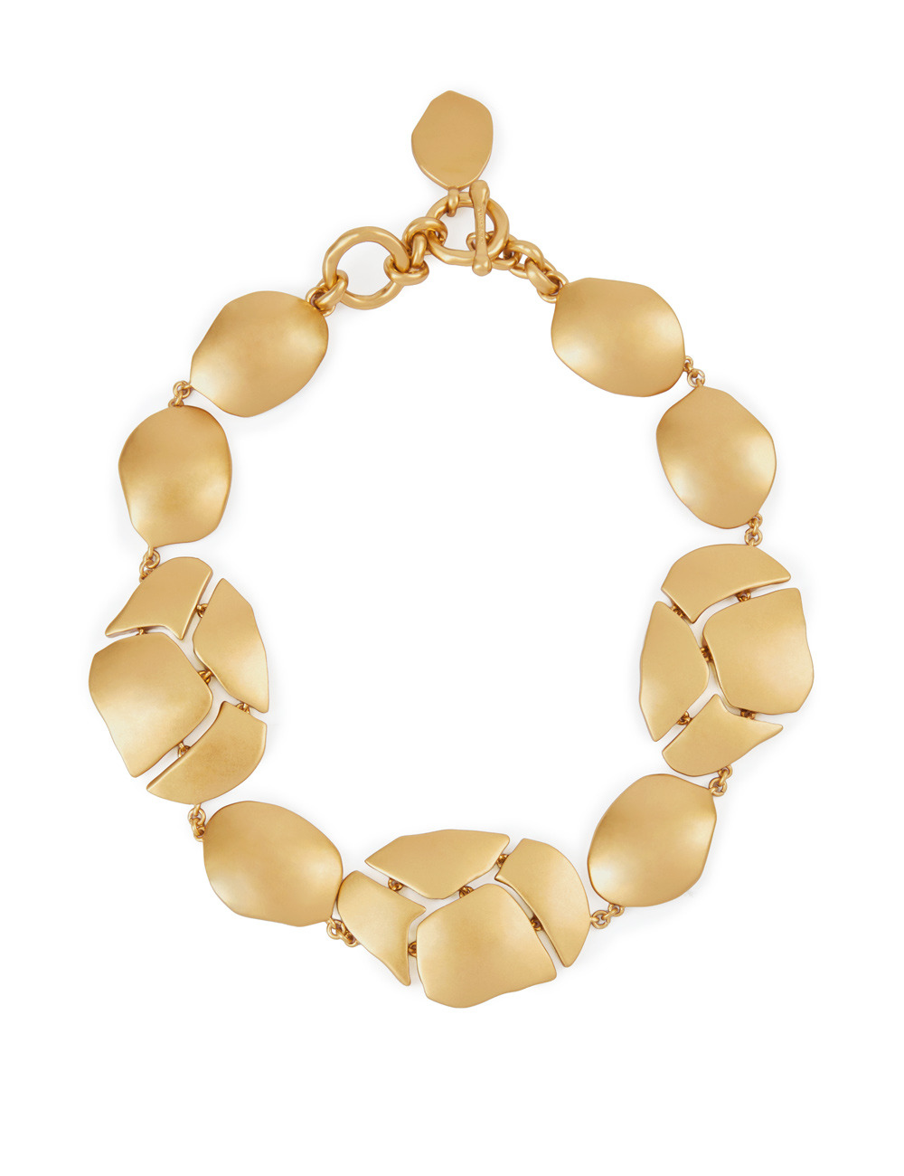 ITEM DETAILS The Byron Necklace in Gold from our Fall 2025 Collection, Hypnotic. A gold plated necklace featuring fragmented sections that create a textured, sculptural look. - 16KT gold plated necklace - Fragmented sections throughout - T-Bar clasp with adjustable fitting Style Code: 5463XF25A1 SIZE DETAILS One size. CARE INSTRUCTIONS 100% brass Zimmermann jewellery is made from 12kt gold-plated brass Please remove during exercising, showering or swimming Avoid contact with perfumes, acetones, creams, and water to prevent damage or discoloration Clean gently with a soft, lint-free cloth. Avoid cleaning products Store in a cool, dry place, away from direct sunlight and heat Always check the label or care card for specific care instructions.