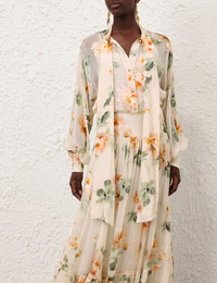 ITEM DETAILS The Carousel Burnout Blouse in Cream Rose from our Spring 2026 Collection, Kindred Spirit. A blouse featuring stand collar with pussybow necktie, billow sleeves, finished with fitted cuffs and centre front buttons. - Long sleeve blouse - Self-tie necktie - Sleeves gathered into fitted cuffs - Centre front pearls buttons - Comes with a separate slip Style Code: 8171TS263 SIZE DETAILS 0P 0 1 2 3 4 Length 25 26.5 27 27 27 27.5 Waist 43.5 45.5 47 49.5 51 53.5 Sleeve 25.5 27 27.5 28 28.5 28.5 Relaxed fit This garment fits true to size Available in size 0P, suited to clients who are under 5'3"/ 160cm Model is 5'9.5"/178 cm, bust size 32C/10C and wears a size 0 Item measurements are in inches CARE INSTRUCTIONS Non burnout: 76% viscose, 24% silk; burnout: 100% silk; slip: 100% viscose Main: Dry clean only code f (hydrocarbon only); Remove any detachable trims prior to dry cleaning; Cover to protect trim; Iron in low temperature with protective cloth; Light steam only; Do not spot clean Slip: Gentle cold hand wash separately with mild detergent; Do not bleach; Dry in shade; Iron in low temperature with protective cloth; Do not tumble dry; Dry cleanable code f (hydrocarbon only); Always check the label or care card for specific care instructions.