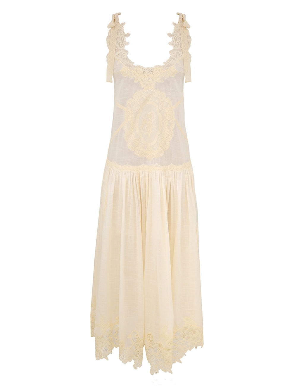 ITEM DETAILS The Cascadian Lace Midi Dress in Cream from our Summer Swim 2025 Collection. A cotton midi dress featuring a scoop neckline, bow tie shoulder straps and lace detailing throughout. - 100% cotton fabric - Spliced fabric with spliced trims across bodice - Self-tie shoulder straps for adjustable fit - Scalloped edges - Gathering across skirt Style Code: 4599DSS255 SIZE DETAILS 0P 0 1 2 3 Length 37.5 41.5 41.5 41.5 42 Bust 34 35.5 38 40 41.5 Hip 44 46.5 49 51 53 Designed for a relaxed, loose fit This garment fits true to size Available in size 0P, suited to clients who are under 5'3"/ 160cm Model is 5'9.5"/178 cm, bust size 32C/10C and wears a size 0 Item measurements are in inches CARE INSTRUCTIONS Main: 100% cotton; lining: 100% cotton; trim: 100% cotton; trim: 60. 9% cotton, 39. 1% polyamide; trim: 100% polyester; trim: 100% nylon Dry clean only code f (hydrocarbon only); Remove any detachable trims prior to dry cleaning; Cover to protect trim; Cool iron with protective cloth; Light steam only; Do not spot clean Always check the label or care card for specific care instructions.