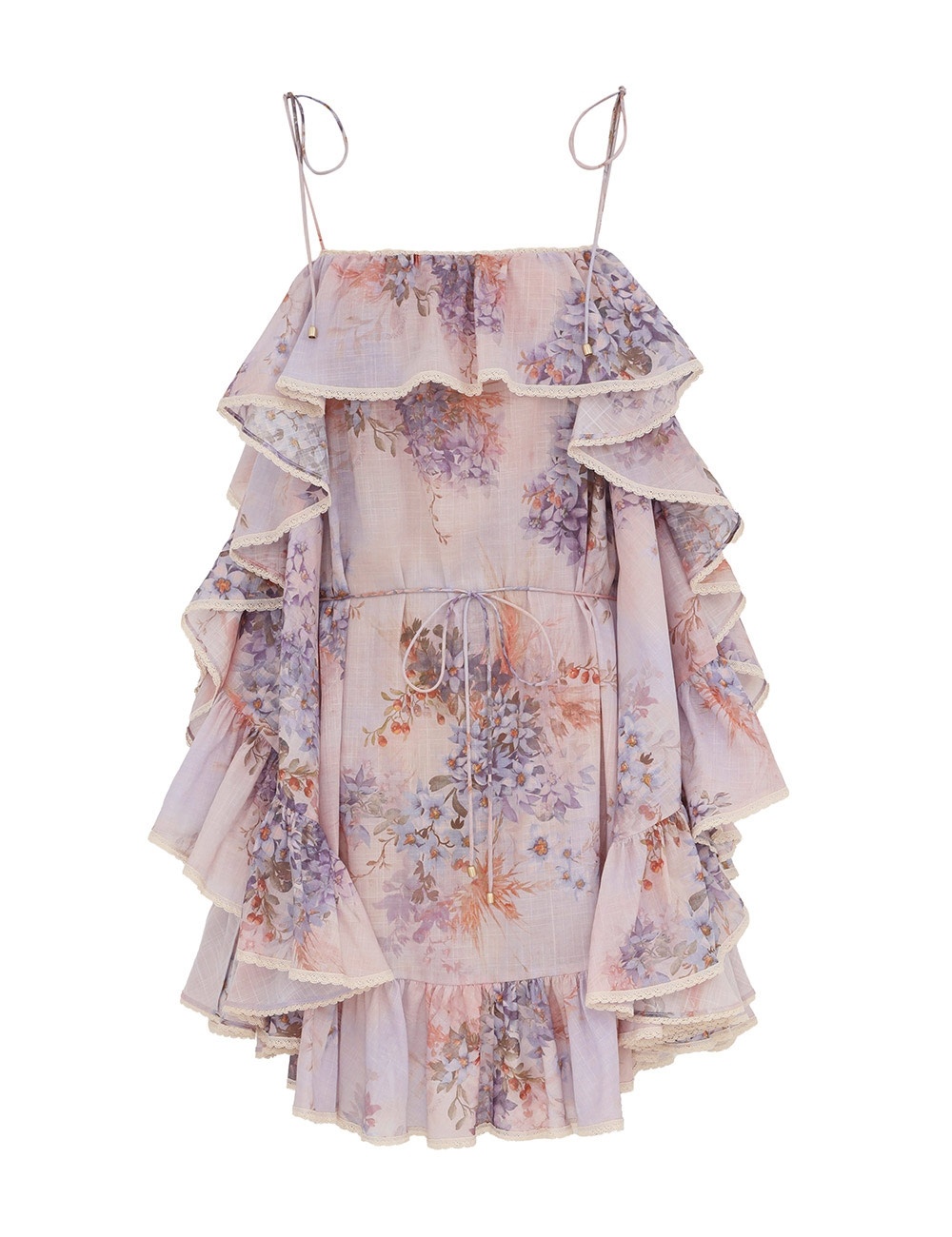 ITEM DETAILS The Cascadian Ruffle Mini Dress in Lilac Botanical Floral from our Summer Swim 2025 Collection. A cotton mini dress featuring a square neckline, bow tie shoulder straps and raglan sleeves, finished with ruffle detailing throughout. - 100% cotton fabric - Long, loose sleeves with wide cuffs - Self-tie shoulder straps for adjustable fit - Removable waist tie belt - Lace trim on frill edges - Scalloped edges Style Code: 3199DSS255 SIZE DETAILS 0P 0 1 2 3 4 Length 29 31.5 31.5 31.5 32 Bust 38 40 42.5 44 46.5 Waist 28.5 43.5 45 47 49 Sleeve 14 15 15.5 15.5 15.5 Designed for a relaxed, loose fit This garment fits true to size Available in size 0P, suited to clients who are under 5'3"/ 160cm Model is 5'9.5"/178 cm, bust size 32C/10C and wears a size 0 Item measurements are in inches CARE INSTRUCTIONS Main: 100% cotton; trim: 100% cotton Dry clean only code f (hydrocarbon only); Remove any detachable trims prior to dry cleaning; Cover to protect trim; Cool iron with protective cloth; Light steam only; Do not spot clean Always check the label or care card for specific care instructions.