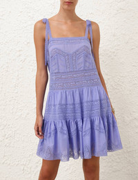 ITEM DETAILS The Coco Lace Mini Dress in Jacaranda Blue from our Summer Swim 2025 Collection. A cotton lace dress featuring a pintuck lace trim bodice, bow-tie shoulder straps and a frilled hem. - 100% cotton fabric - Square neckline - Self tie shoulder straps - Invisible zip closure at centre back - Lace trims throughout Style Code: 4576DSS254 SIZE DETAILS 0P 0 1 2 3 4 Length 33 35 35.5 36 36.5 Bust 31.5 33 35.5 38 39.5 Designed for a slightly loose fit, with a closer fit at the bust This garment fits true to size Available in size 0P, suited to clients who are under 5'3"/ 160cm Model is 5'9.5"/178 cm, bust size 32C/10C and wears a size 0 Item measurements are in inches CARE INSTRUCTIONS Main: 100% cotton; lining: 100% cotton; trim: 100% cotton; trim: 100% polyester Dry clean only code f (hydrocarbon only); Remove any detachable trims prior to dry cleaning; Cover to protect trim; Cool iron with protective cloth; Light steam only; Do not spot clean Always check the label or care card for specific care instructions.