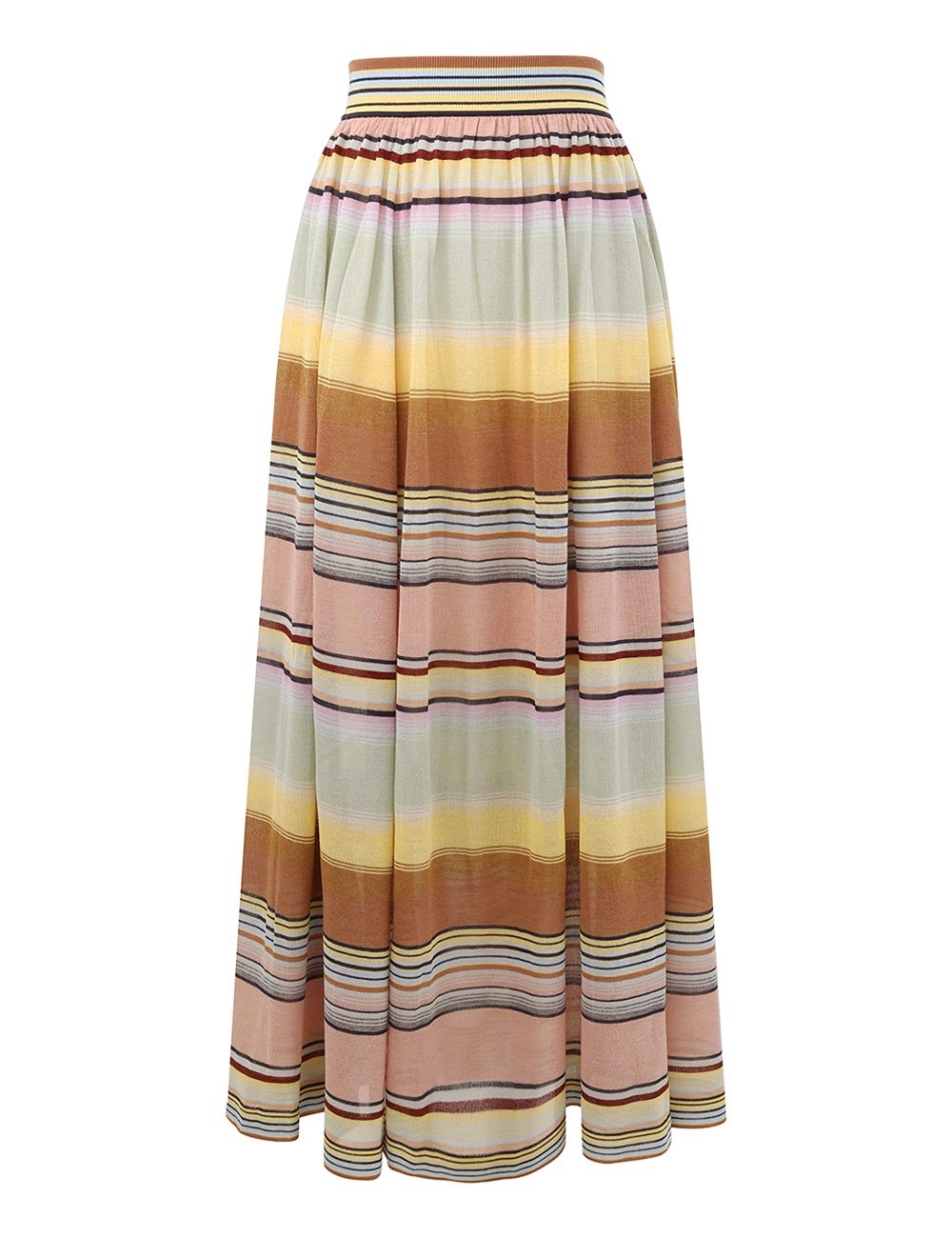 ITEM DETAILS The Coco Stripe Circle Skirt in Stripe from our Summer Swim 2025 Collection. A knit midi skirt featuring contrast stripes, a thick elasticated waistband and a soft A-line silhouette. - Knit mid-length skirt - Fixed waistband - Slip on style Campaign: This style was featured in the Summer Swim 2025 Campaign. Style Code: 3051SSS254 SIZE DETAILS 0P 0 1 2 3 Length 47 50 50 50 50 Waist 48 50 56 62 66 Designed with an elasticated waist for a flexible fit This garment fits true to size Available in size 0P, suited to clients who are under 5'3"/ 160cm Model is 5'9.5"/178 cm, bust size 32C/10C and wears a size 0 Item measurements have been rounded to the nearest cm CARE INSTRUCTIONS Main : 69% viscose 31% polyester lining : 76% viscose 24% polyamide Dry clean only code f (hydrocarbon only); Remove any detachable trims prior to dry cleaning; Cover to protect trim; Cool iron with protective cloth; Do not spot clean; Store garment flat do not hang Always check the label or care card for specific care instructions.