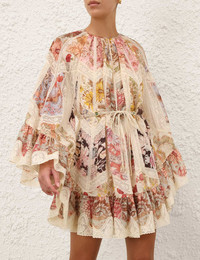 ITEM DETAILS The Daylight Flutter Dress in Spliced Print from our Resort Swim 2026 Collection. A cotton mini dress featuring long raglan sleeves with exaggerated wide flare cuffs and self-tie waist belt, finished with an asymmetric hem and lace trim detailing. - Cotton fabric - Round high neckline - Rope waist-tie belt with beads - Invisible centre back zip closure - Heavily gathered - Spliced throughout - Comes with a separate slip Style Code: 6499DRS263 SIZE DETAILS 0P 0 1 2 3 4 Length 31.5 33.5 34 34.5 35 35.5 Bust 46.5 47 49.5 51 53 54.5 Sleeve 25 27 27 27.5 28 28.5 Designed for a relaxed fit This garment fits true to size Available in size 0P, suited to clients who are under 5'3"/ 160cm Model is 5'9.5"/178 cm, bust size 32C/10C and wears a size 0 Item measurements are in inches CARE INSTRUCTIONS Main: 100% cotton; trim: 100% cotton; trim 2: 100% polyester; slip: 86% recycled polyester, 14% elastane Main: dry clean only code f (hydrocarbon only); Remove any detachable trims prior to dry cleaning; Cover to protect trim; Iron in low temperature with protective cloth; Light steam only; Do not spot clean Slip: gentle cold hand wash separately with mild detergent; Do not bleach; Dry in shade; Iron in low temperature with protective cloth; Do not tumble dry; Dry cleanable code f (hydrocarbon only); Always check the label or care card for specific care instructions.