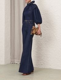 ITEM DETAILS The Denim Fitted Blouse in Ink from our Fall 2025 Collection, Hypnotic. A denim blouse featuring a stand collar, pussybow necktie, billow sleeves with elasticated cuffs and an invisible zip closure at the centre back. - 100% cotton denim - Asymmetrical hem - Quarter-length billow sleeves with elasticated cuffs - Pussybow necktie with gold button detailing - Invisible zip closure at centre back - Topstitch detailing throughout Style Code: 5009TF25R SIZE DETAILS 0P 0 1 2 3 4 Length 60 63 64 65 65 66 Bust 82 86 92 96 102 108 Waist 72 74 80 84 90 94 Sleeve 38 40 40 40 40 40 Designed to be fitted at the shoulders and bust, relaxed through the sleeves This garment fits true to size Available in size 0P, suited to clients who are under 5'3"/ 160cm Model is 5'9.5"/178 cm, bust size 32C/10C and wears a size 0 Item measurements have been rounded to the nearest cm CARE INSTRUCTIONS 100% cotton Gentle cold machine wash separately with mild detergent; Remove any detachable trims prior to cleaning Cover to protect trim; Do not soak or bleach; Do not tumble dry; Dry in shade without delay; Cool iron with protective cloth; Do not spot clean; Dry cleanable code p Always check the label or care card for specific care instructions.