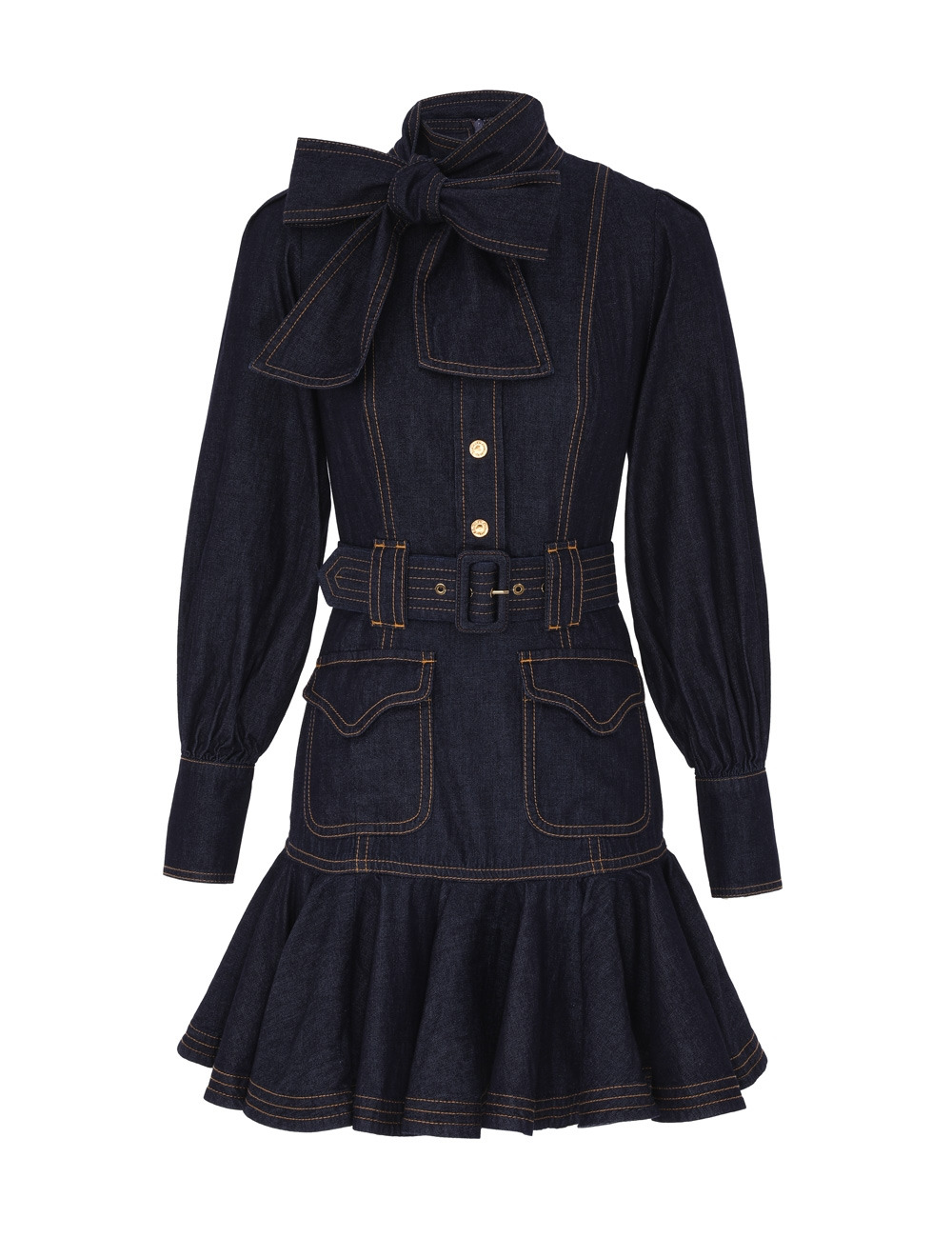 ITEM DETAILS The Denim Flip Dress in Night Sky from our Fall 2025 Collection, Hypnotic. A denim long sleeve mini dress featuring a pussybow necktie, waist belt, front flap pockets and a frilled hem skirt. - 100% cotton denim - Stand collar with self-tie necktie - Long billow sleeves - Elongated fitted cuffs with snap closures - Removable waist buckle belt - Invisible zip closure at centre back - Topstitching throughout Style Code: 5410DF25R SIZE DETAILS 0P 0 1 2 3 4 Length 163 163 165 166 168 169 Bust 80 84 90 96 102 106 Waist 64 68 72 78 82 88 Sleeve 50 54 54 55 56 56 Hip 92 98 102 108 112 118 Designed to be slightly fitted at the bust and waist This garment fits true to size Available in size 0P, suited to clients who are under 5'3"/ 160cm Model is 5'9.5"/178 cm, bust size 32C/10C and wears a size 0 Item measurements have been rounded to the nearest cm CARE INSTRUCTIONS 100% cotton Gentle cold machine wash separately with mild detergent; Remove any detachable trims prior to cleaning Cover to protect trim; Do not soak or bleach; Do not tumble dry; Dry in shade without delay; Cool iron with protective cloth; Do not spot clean; Dry cleanable code p Always check the label or care card for specific care instructions.