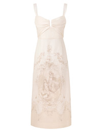 ITEM DETAILS The Drape Midi Dress in Mermaid Toile from our Cruise 2026 Collection, Twisted Romance. A linen midi dress featuring a fitted bodice, shirred back and straps, keyhole detailing across bust, finished with an invisible zip closure and ruching. - Linen fabric - Sleeveless midi dress - Sweetheart neckline with keyhole feature - Underwire bust with ruching - Shirred at back bodice - Invisible zip closure at centre back - Centre back vent opening - Lined skirt Style Code: 6962DC26R SIZE DETAILS 0P 0 1 2 3 4 Length 36 38.5 38.5 38.5 38.5 38.5 Bust 27.5 29 31.5 33 35.5 37 Waist 25 26 28.5 30 32.5 34.5 Hip 36 38.5 41 42.5 45 46.5 Fitted bodice, relaxed through the hips Mid-weight, non-stretchy fabric Due to the boning structure, the bodice may feel restrictive This garment fits true to size Available in size 0P, suited to clients who are under 5'3"/ 160cm Model is 5'9.5"/178 cm, bust size 32C/10C and wears a size 0 Item measurements are in inches CARE INSTRUCTIONS Main: 100% linen; lining: 100% cotton Dry clean only code f (hydrocarbon only); Remove any detachable trims prior to dry cleaning; Cover to protect trim; Iron in low temperature with protective cloth; Light steam only; Do not spot clean Always check the label or care card for specific care instructions.