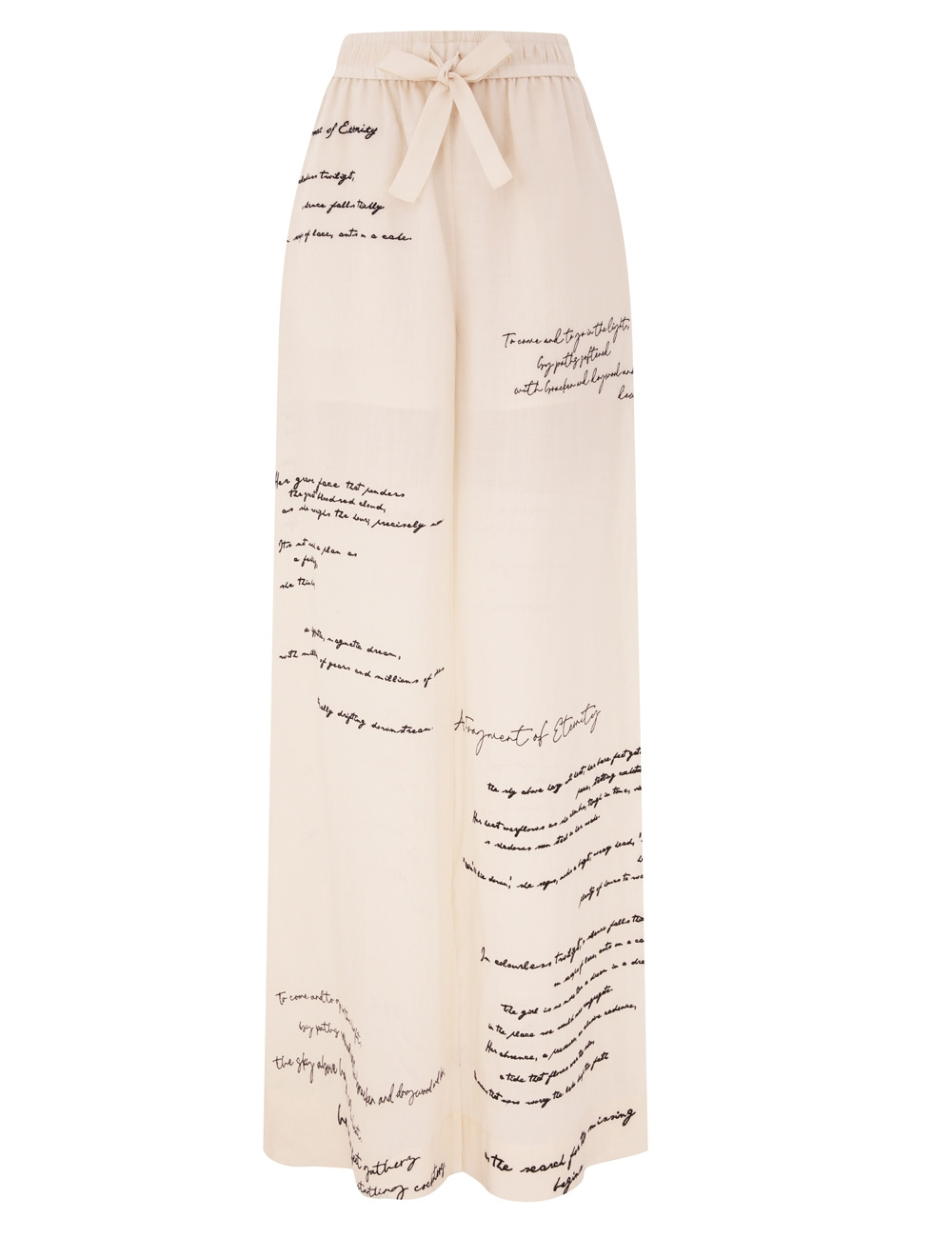 ITEM DETAILS The Dream Embroidered Pant in Cream Poem from our Fall 2025 Collection, Hypnotic. A ramie mid-rise pant featuring an elasticated waistband with drawstring waist and side pockets. - 100% ramie fabric - Relaxed fit pant - Elasticated waistband with drawstring tie - Functional side seam pockets - Placement embroidery throughout Style Code: 5176PF253 SIZE DETAILS 0P 0 1 2 3 4 Length 40 44 44 44.5 44.5 45 Waist 25 26 28.5 30.5 32.5 34.5 Hip 39.5 41.5 43.5 45.5 47 49.5 Inseam 28.5 32.5 32.5 32.5 32.5 32.5 Designed with an elasticated waistband for a flexible fit Mid-rise waist with a full-length leg This garment fits true to size Available in size 0P, suited to clients who are under 5'3"/ 160cm Model is 5'9.5"/178 cm, bust size 32C/10C and wears a size 0 Item measurements are in inches CARE INSTRUCTIONS Main: 100% ramie; lining: 100% ramie Dry clean only code f (hydrocarbon only); Remove any detachable trims prior to dry cleaning; Cover to protect trim; Cool iron with protective cloth; Light steam only; Do not spot clean Always check the label or care card for specific care instructions.