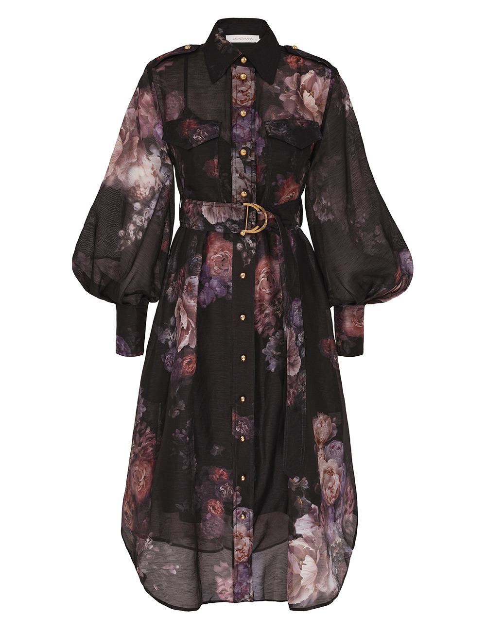 ITEM DETAILS The Dream Utility Shirt Dress in Black Floral from our Fall 2025 Collection, Hypnotic. A silk linen midi dress featuring a classic collar, long blouson sleeves, gold buttons down the centre front, finished with a D-ring waist belt. - Sheer style midi dress - Elongated, fitted cuffs with button closures - Functional gold buttons down centre front placket - Shoulder tab detailing with buttons - Removable D-ring belt at the waist - Comes with a separate slip Style Code: 5160DF253 SIZE DETAILS 0P 0 1 2 3 4 Length 45.5 49 49.5 49.5 50 50.5 Bust 31.5 34 36 38 40 41.5 Waist 26 27 29 30.5 33 34.5 Sleeve 18.5 20 20.5 21 21 21.5 Fitted at the bust and waist, relaxed through the hips This garment fits true to size Available in size 0P, suited to clients who are under 5'3"/ 160cm Model is 5'9.5"/178 cm, bust size 32C/10C and wears a size 0 Item measurements are in inches CARE INSTRUCTIONS Main: 53% linen, 47% silk; slip: 86% recycled polyester, 14% elastane Dry clean only code f (hydrocarbon only); Remove any detachable trims prior to dry cleaning; Cover to protect trim; Cool iron with protective cloth; Light steam only; Do not spot clean Gentle cold hand wash separately with mild detergent Remove any detachable trims prior to cleaning Cover to protect trim; Do not soak, rub or wring Do not bleach Do not tumble dry Dry flat in shade Cool iron with protective cloth Do not spot clean Dry cleanable code p Always check the label or care card for specific care instructions.