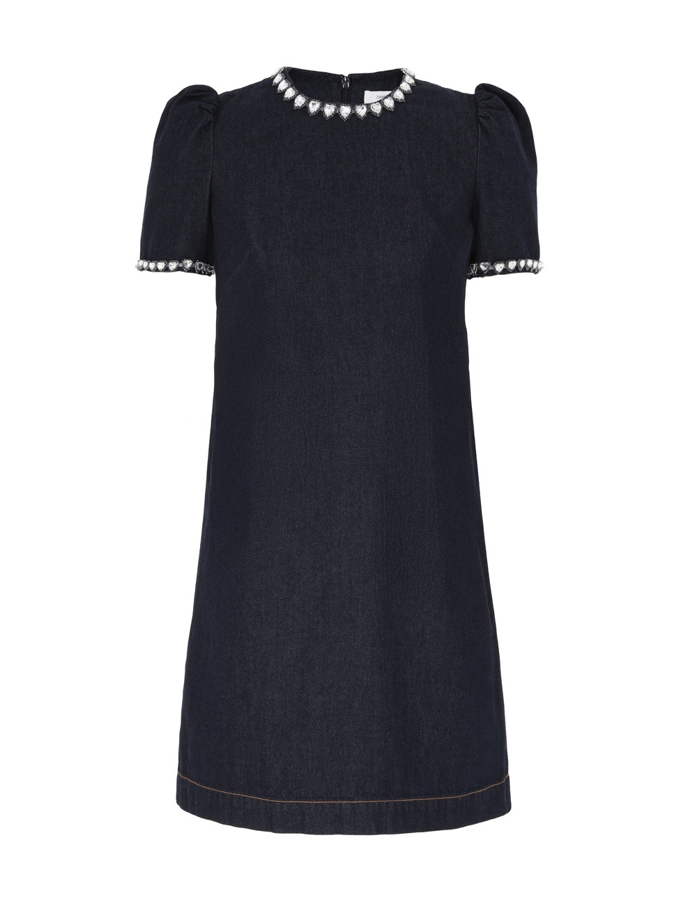 ITEM DETAILS The Embellished Denim Dress in Night Sky from our Fall 2025 Collection, Hypnotic. A mini denim dress featuring a round neckline, tulle-inserted sleeve head and centre back invisible zip closure, finished with heart crystal trim detailing. - 100% cotton denim - Heart-shaped jewel crystal trim at sleeves and neckline - Invisible zip closure at centre back - Gathered shoulders creating a puffed silhouette Style Code: 5303DF25R SIZE DETAILS 0P 0 1 2 3 4 Length 78 83 83 85 87 88 Bust 82 88 94 98 104 108 Waist 80 84 90 94 100 104 Sleeve 24 25 26 26 27 28 Hip 88 92 98 102 108 114 Designed for a slightly loose fit, with a closer fit at the bust This garment fits true to size Available in size 0P, suited to clients who are under 5'3"/ 160cm Model is 5'9.5"/178 cm, bust size 32C/10C and wears a size 0 Item measurements have been rounded to the nearest cm CARE INSTRUCTIONS Main :100% cotton trim : 100% polyester Dry clean only code f (hydrocarbon only); Remove any detachable trims prior to dry cleaning; Cover to protect trim; Do not steam; Cool iron with protective cloth; Do not spot clean Always check the label or care card for specific care instructions.