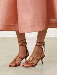 ITEM DETAILS The Gleam Sandal 65 in Avalon from our Spring 2025 Collection, Illumination. A leather stiletto sandal featuring lace-up detailing and stone effect pebbles at the front. - Leather stiletto sandal - Made in Italy - Round toe - Stone effect pebbles - Nappa upper and leather outsole - 65mm stiletto heel Style Code: 3437FS25A1 SIZE DETAILS This shoe fits true to size. CARE INSTRUCTIONS Lining: 100% leather; sock lining-sottopiede: 100% leather; outsole-suola: 100% leather; main: 100% leather Your handcrafted item is made from high-quality leather which features natural variations in tone, grain, and texture. Colours may fade with exposure to light and heat, and humidity can lead to colour transfers onto lighter fabrics. Protect your item from direct contact with water, solvents, oils, perfumes, and cosmetics which can cause irreversible damage. Store in a dry environment in the original dust bag Always check the label or care card for specific care instructions.