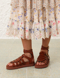 ITEM DETAILS The Goldie Gladiator in Pecan from our Summer Swim 2025 Collection. A leather gladiator sandal featuring a double buckle detail and scalloped edges. - Leather flatform sandal - Ankle strap with buckle detail - Soft round toe - Made in Spain Style Code: 2808FS25A2 SIZE DETAILS This shoe fits true to size. CARE INSTRUCTIONS Lining: 100% leather; full sock-solettone sottopiede: 100% leather; outsole-suola: 100% thermoplastic polyurethane (tpu); main: 100% leather Your handcrafted item is made from high-quality leather which features natural variations in tone, grain, and texture. Colours may fade with exposure to light and heat, and humidity can lead to colour transfers onto lighter fabrics. Protect your item from direct contact with water, solvents, oils, perfumes, and cosmetics which can cause irreversible damage. Store in a dry environment in the original dust bag Always check the label or care card for specific care instructions.