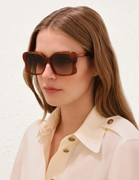 ITEM DETAILS The Goldie Oversize in Havana from our Fall 2025 Collection, Hypnotic. An acetate oversized square frame featuring scalloped frame detailing and solid lenses. - Acetate frame - Signature scalloped detail - Solid coloured lens - Category 2 lenses - Comes with ZIMMERMANN case, dust bag and storage box Style Code: 0915XF25A1 SIZE DETAILS Oversized frame. LENS: Havana: Category 2 FRAME: Lens: 2 Nose bridge: 1 Temple length: 6 Item measurements are in inches CARE INSTRUCTIONS Acetate Comes with a case and dust bag. Clean your sunglasses by gently rubbing them with a lens cleaning cloth and a liquid cleaner specifically designed for eyewear lenses. Whenever setting down your frames, place them lens side up to avoid scratching. When frames are not being worn, place them inside the protective case. Avoid leaving your sunglasses in the car, especially on hot days, to prevent warping. Wearing sunglasses on the top of your head can stretch the hinges over time - avoid if possible. Always check the label or care card for specific care instructions.