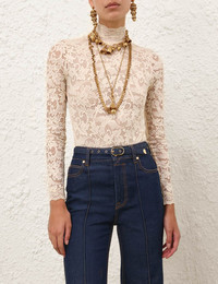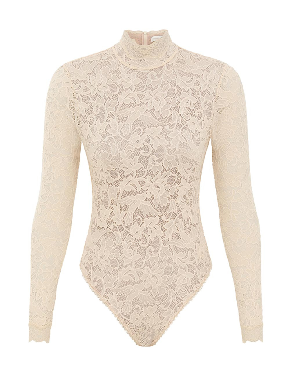 ITEM DETAILS The High Neck Bodysuit in Cream from our Fall 2025 Collection, Hypnotic. A lace bodysuit featuring a high neckline, delicate lace throughout, and long sleeves. - Stretch lace bodysuit - Long fitted sleeves - Mesh lining - Gusset snap fastening - Invisible centre back zip closure - Lace trim throughout - Scalloped edges Style Code: 5435TF25R SIZE DETAILS 0P 0 1 2 3 4 Length 24.5 26.5 27 27.5 28.5 28.5 Bust 13.5 14.5 15.5 16.5 17.5 18.5 Waist 23 24.5 25 25 25 25.5 Hip 13.5 14 15.5 16 17.5 18 Designed to be fitted on the body This garment fits true to size Available in size 0P, suited to clients who are under 5'3"/ 160cm Model is 5'9.5"/178 cm, bust size 32C/10C and wears a size 0 Item measurements are in inches CARE INSTRUCTIONS Main: 90% polyamide, 10% elastane; lining: 81% polyester, 19% elastane Gentle cold hand wash separately with mild detergent Remove any detachable trims prior to cleaning Cover to protect trim; Do not soak, rub or wring Do not bleach Do not tumble dry Dry in shade Do not iron Do not spot clean Dry cleanable code f (hydrocarbon only) Always check the label or care card for specific care instructions.