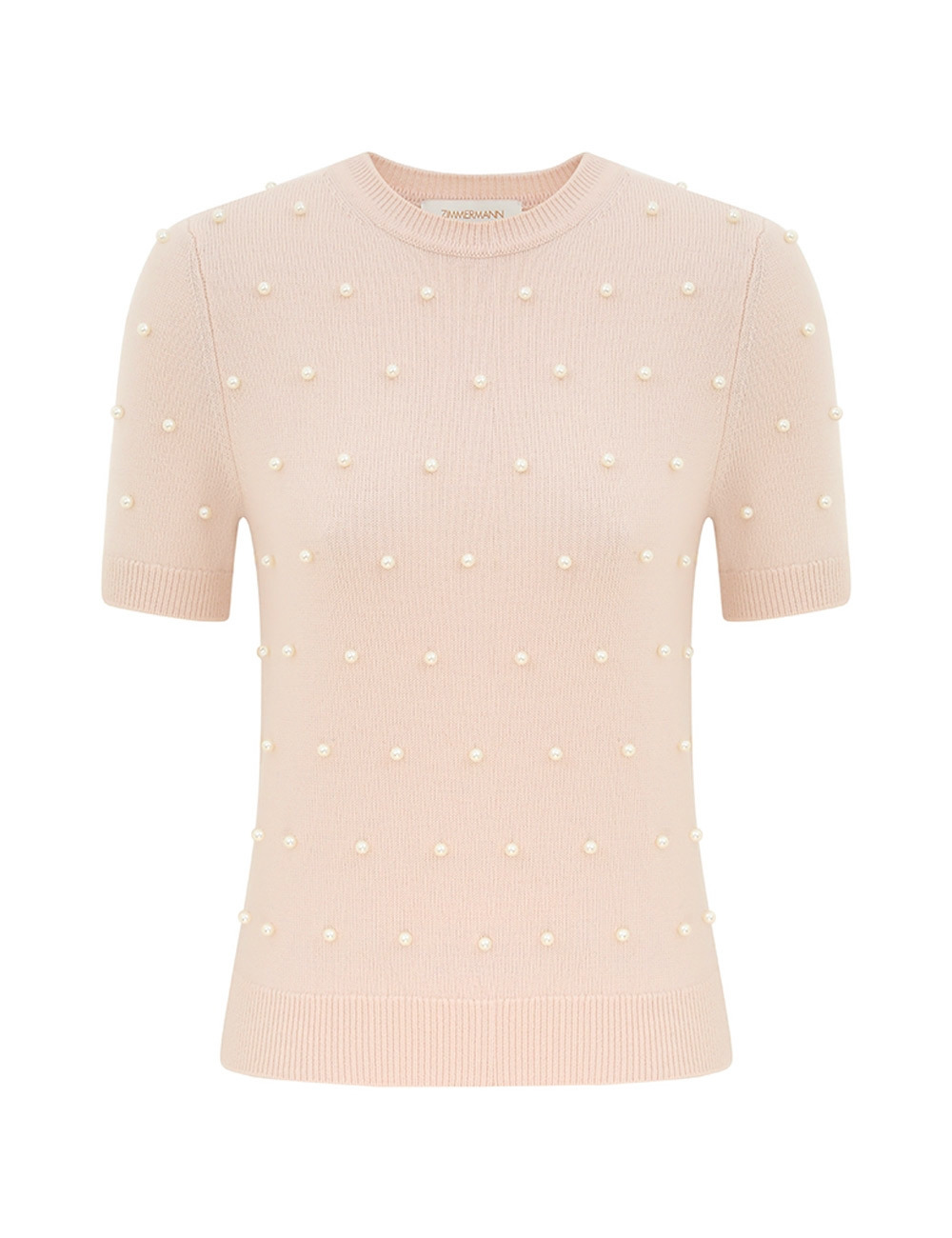 ITEM DETAILS The Hypnotic Beaded Knit Tee in Chalk from our Fall 2025 Collection, Hypnotic. A short sleeve wool t-shirt featuring a round neckline, ribbed trim and bead detailing throughout. - 100% merino wool - Slim fit tee - Ribbed neckline, cuffs and hem - Beaded detailing across the front and back Style Code: 5516TF251 SIZE DETAILS 0P 0 1 2 3 4 Length 51 54 55 56 56 57 Bust 78 84 90 94 100 104 Sleeve 22 23 24 24 25 25 Designed for a regular fit This garment fits true to size Available in size 0P, suited to clients who are under 5'3"/ 160cm Model is 5'9.5"/178 cm, bust size 32C/10C and wears a size 0 Item measurements have been rounded to the nearest cm CARE INSTRUCTIONS 100% wool Dry clean only code f (hydrocarbon only); Remove any detachable trims prior to dry cleaning; Cover to protect trim; Cool iron with protective cloth; Do not spot clean; Store garment flat do not hang Always check the label or care card for specific care instructions.